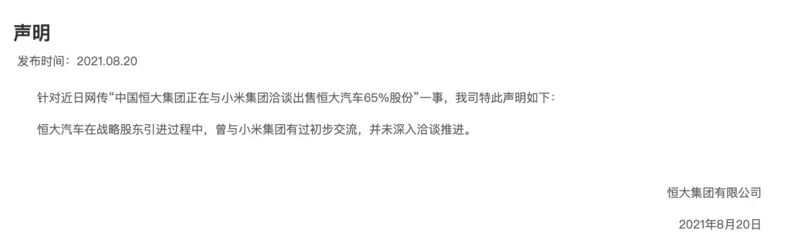 8月20日,恒大集团就网络热传的“中国恒大集团正在与小米集团洽谈出售恒大汽车65%股份”一事,发布了最新的官方回应,表示有过初步交流,并未深入洽谈推进。声明原文如下: