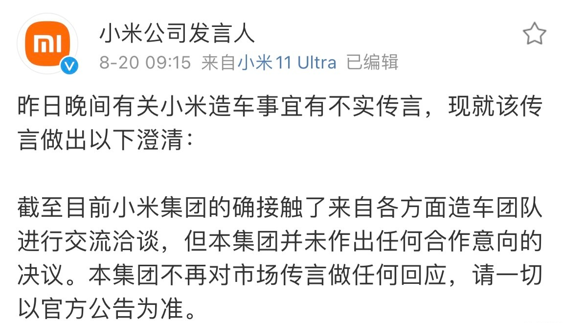 同时,小米公司也做出了相关澄清,官方称:截至目前小米集团的确接触了来自各方面造车团队进行交流洽谈,但本集团并未作出任何合作意向的决议。本集团不再对市场传言做任何回应,请一切以官方公告为准。