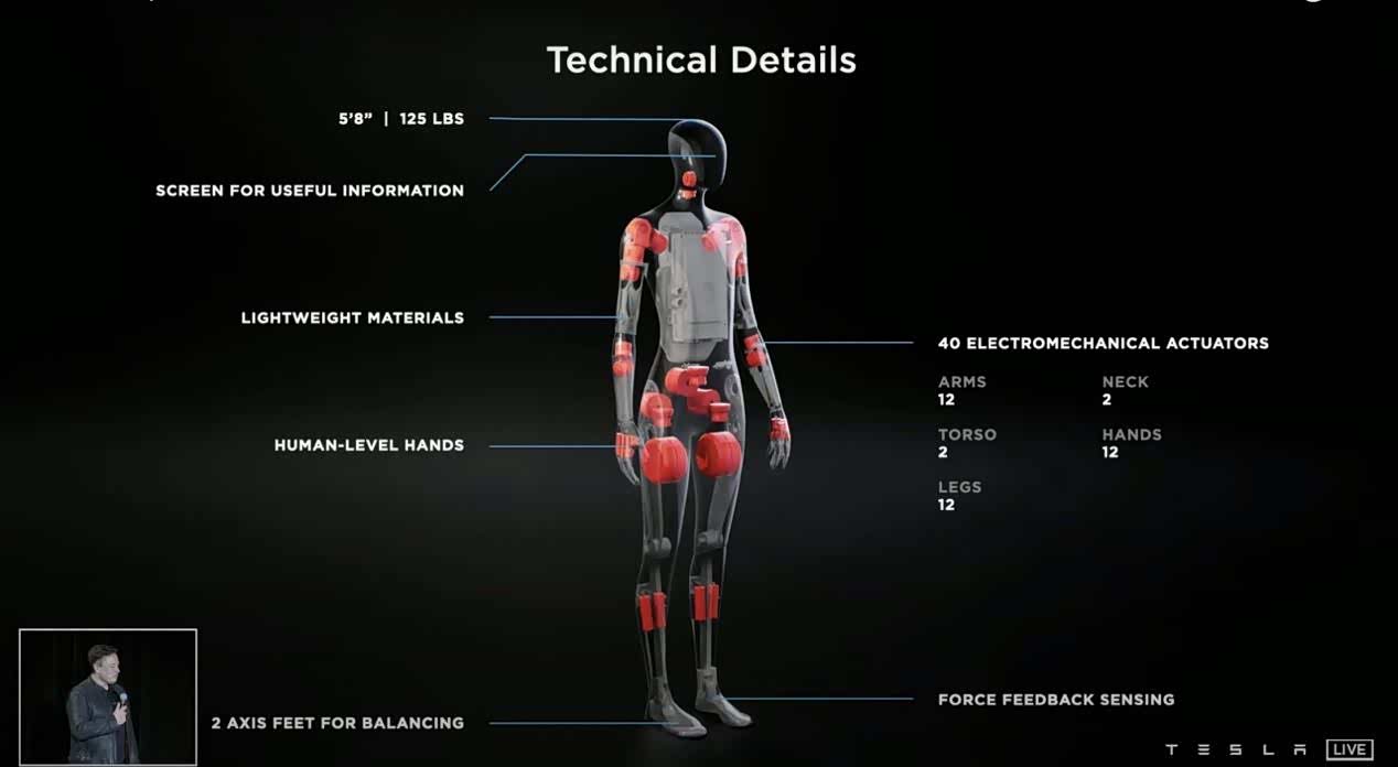机器人的脸上会有一个屏幕,用来显示有用的信息。此外,它将装配拟人手臂,四肢由40个电动机驱动,两只脚具备「力反馈感应平衡」和较强的灵活性。马斯克半开玩笑地表示,这款机器人跑步速度最快能达到5英里/小时(大约2.2米/秒)。