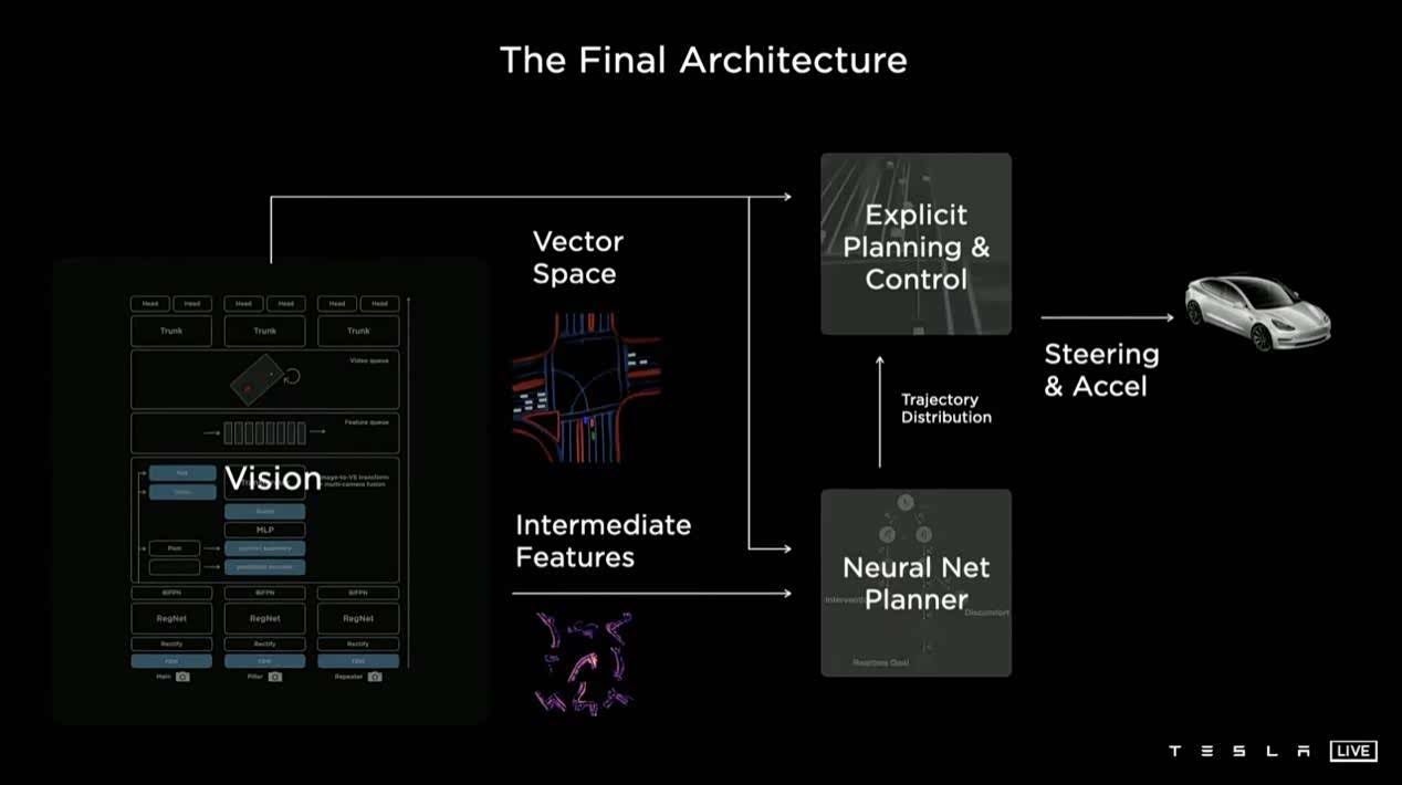 相比于过去通过图片作为场景感知的方式,「视神经网络」技术能事实绘制实景地图,更精确地监测周围环境及物体。特斯拉AI 负责人Andrej Karpathy表示,AI可以被看做是一种生物,而「视神经网络」是生物的一部分。