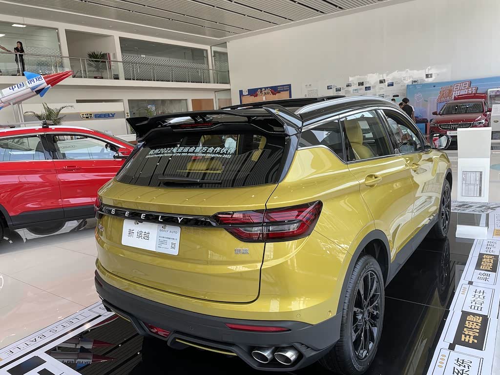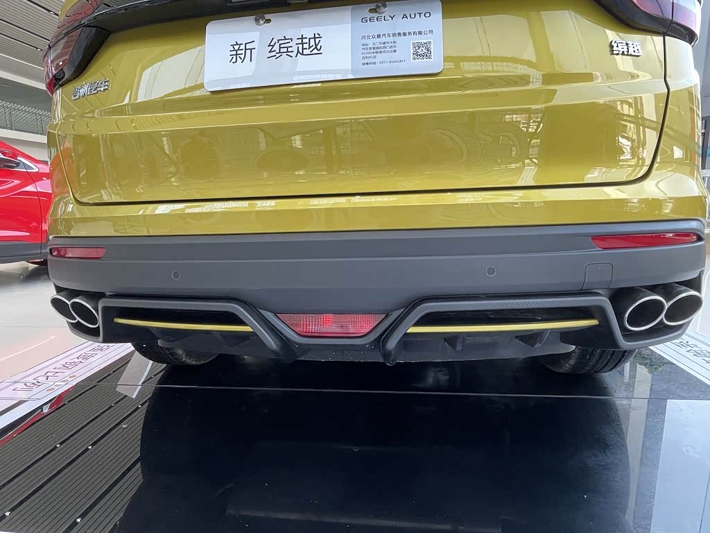 我们再来看看新缤越。与第四代帝豪一样,新缤越也给人以低趴、运动的感觉,碳纤维的采用双色点缀、熏黑处理的轮辋和运动卡钳,都给人以运动时尚的感觉。特别是尾部的赛车级双边四排气管,运动气息扑面而来,真是帅呆了。