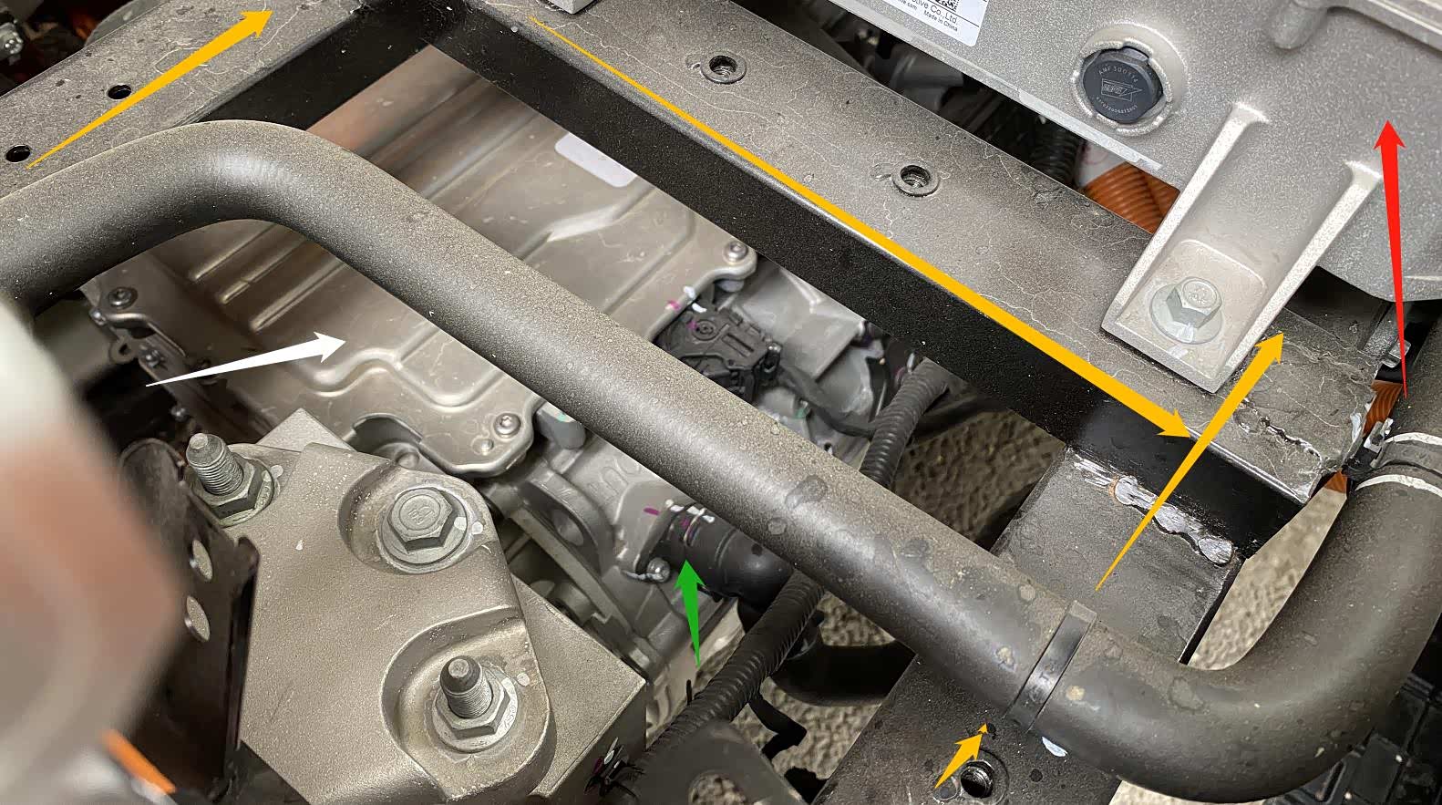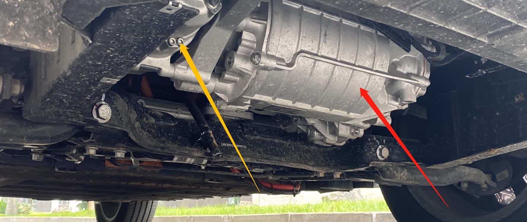 威马W6采用钢材质H型前副车架,用来承载“3合1”电驱动系统(红色箭头所指)和电动空调压缩机(黄色箭头所指),麦弗逊式下A型摆臂和前转向节都采用钢材质。