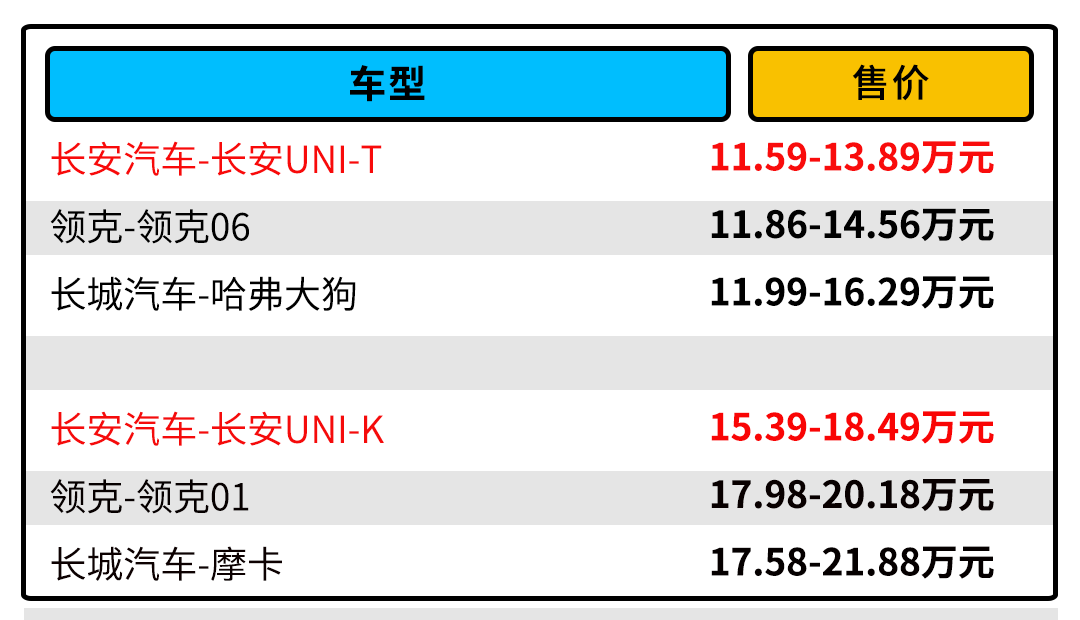 当然相信各位更想知道新车售价多少,目前官方也没透出任何信息,但不妨碍买买君预测,作为参考,目前长安UNI-T售价区间为11.59-13.89万元,相对同级别领克06和哈弗大狗要亲民一些,而长安UNI-K售价区间为15.39-18.49万元,同样相比同级别领克01和WY摩卡也要实惠。