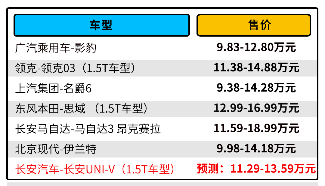 如此看来,长安UNI-V的售价应不会高于同级别领克03(1.5T车型售价区间11.38-14.88万元),再结合最近上市的传祺影豹(售价区间9.83-12.80万元)和名爵MG6 Pro(售价区间10.38-13.98万元),可以推断出长安UNI-V的起售价不会超过12万元,先行推出的1.5T车型预计售价区间为11.29-13.59万元。
