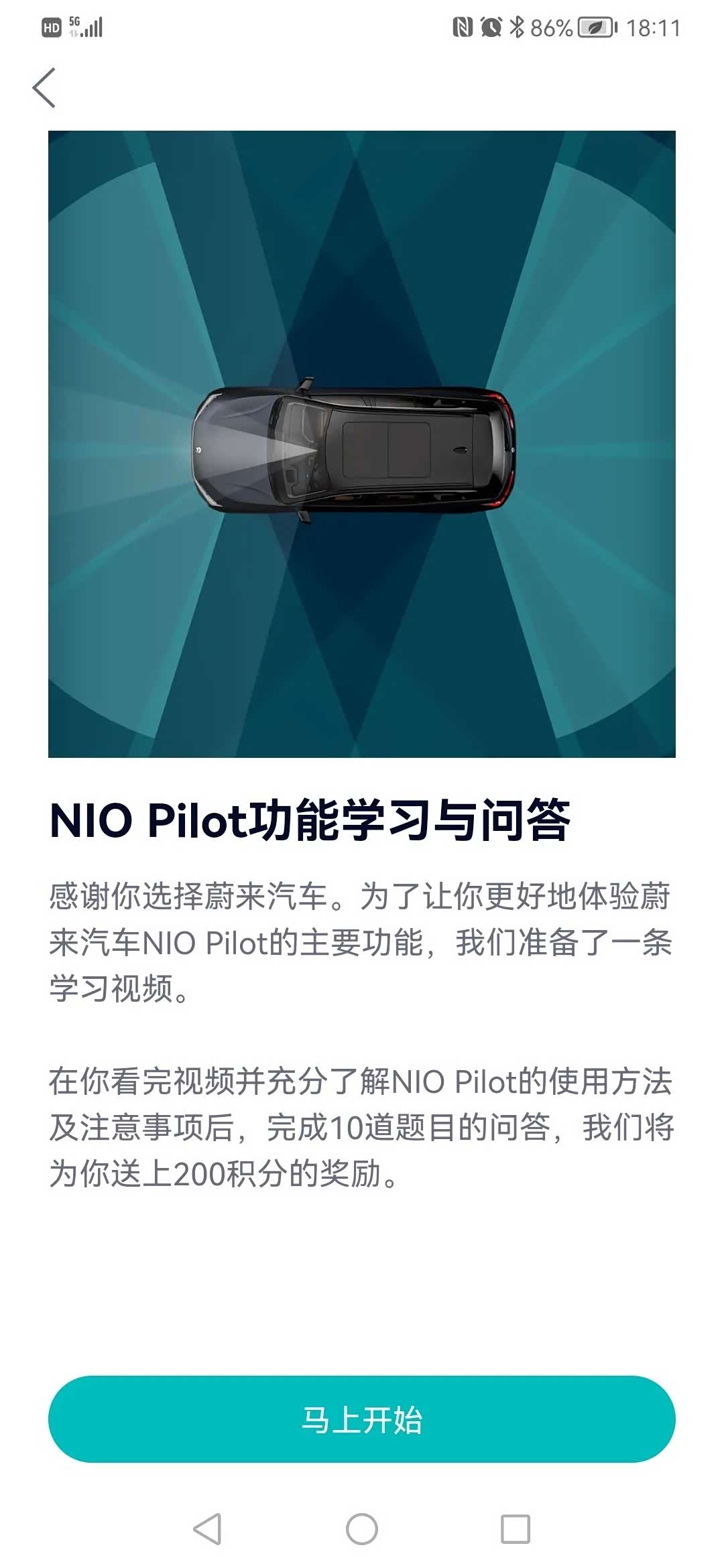 8月24日,有多位蔚来车主在社交平台上反馈称,蔚来官方向车主推送了关于 NIO Pilot 功能学习与问答,包括一段长达6分钟的学习视频以及10道问答题。视频内容主要包括NIO Pilot的主要功能和注意事项,视频内容明确指出NIO Pilot是辅助驾驶,并非自动驾驶。在用户驾驶过程中,用户是驾驶掌控的主体,NIO Pilot只是起辅助作用。视频播完之后,用户才允许答题,并在全部正确后奖励200积分。按照当前蔚来积分的实际价值来换算,200积分相当于“20元”,可在蔚来商城直接兑换购买实物。