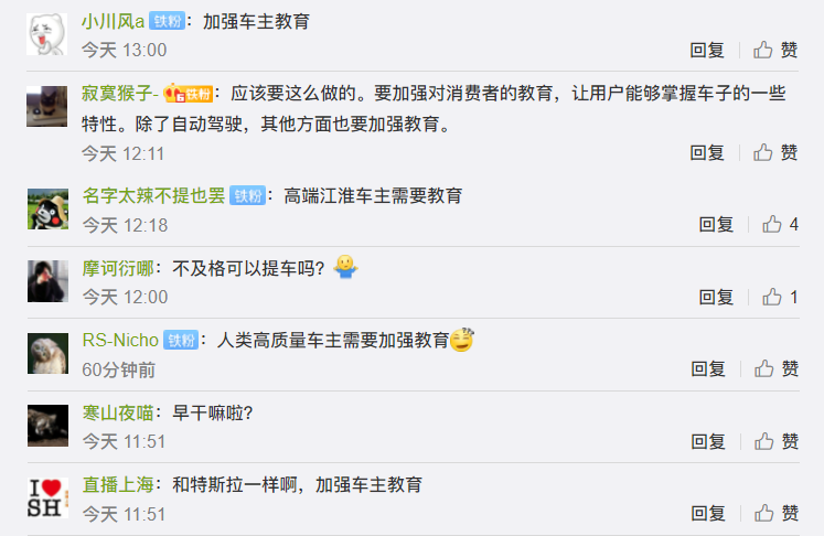 因此,蔚来汽车此次新增了视频教学和答题缓解,不少网友也纷纷表示“人类高质量车主需要加强教育”、“加强车主教育”,也有网友评论“要加强对消费者的教育,让用户能够掌握车子的一些特性。除了自动驾驶,其他方面也要加强教育。”有蔚来车主则在蔚来APP上建议,各家厂商将此功能加入车机当中强制学习。