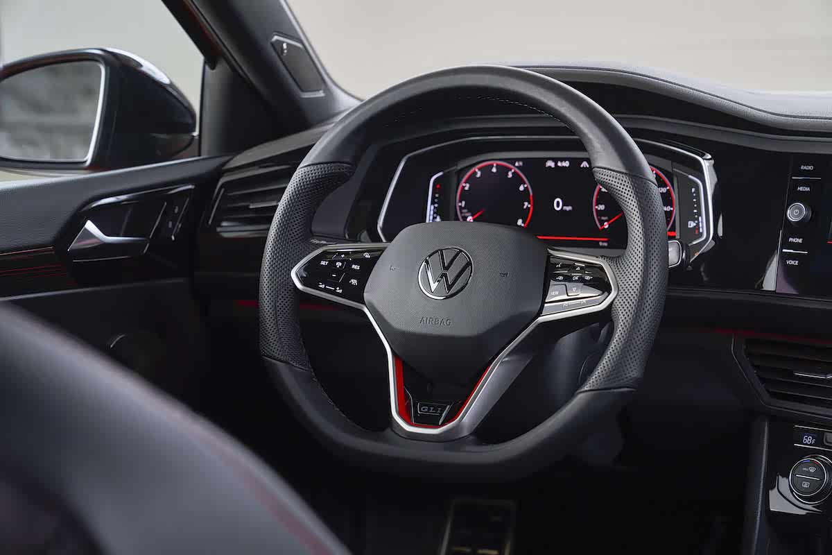 至于内饰部分,捷达和捷达GLI中控台布局维持向驾驶者一侧倾斜,传统样式的空调控制面板与排挡杆没有如同高尔夫MK8那样进行升级,但8寸Digital Cockpit液晶仪表盘的出现(GLI为10寸Digital Cockpit Pro),大幅地提升了车内的科技感。此外,改款的重点就是座椅版型,GLI保留了相同的座椅,但有新的红色线条装饰和打孔皮革座椅。另外也引入了两种内饰色调,分别为火山棕和黑色皮革配色方案。全新的三幅式多功能方向盘也是整个内饰的视觉焦点,GLI上的方向盘使用了触摸控制面板并在方向盘下方嵌入了GLI徽章。