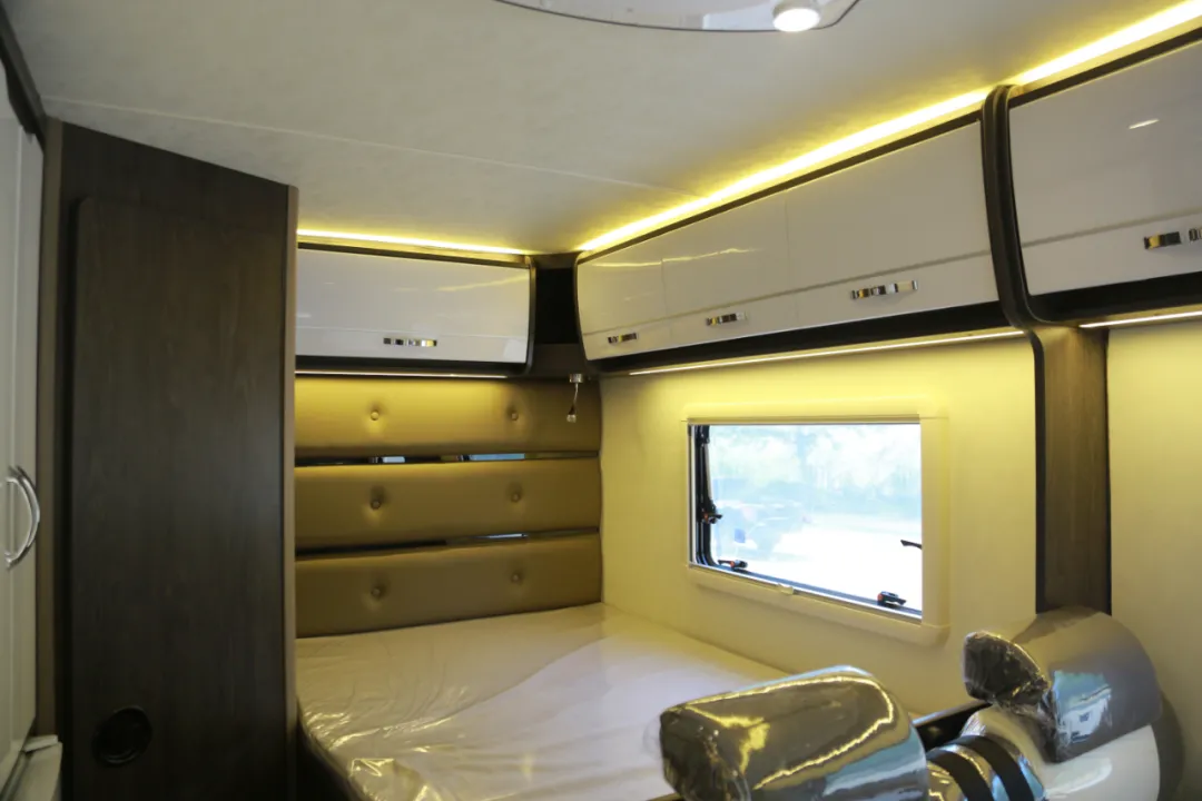 这是一款不拓展的车型,但是进入内部,给人的感觉却是非常宽敞,原因在于凤凰将内部空间利用极大化,为生活区留出了大空间,再加上车侧的大窗,增加了车内的通透性。