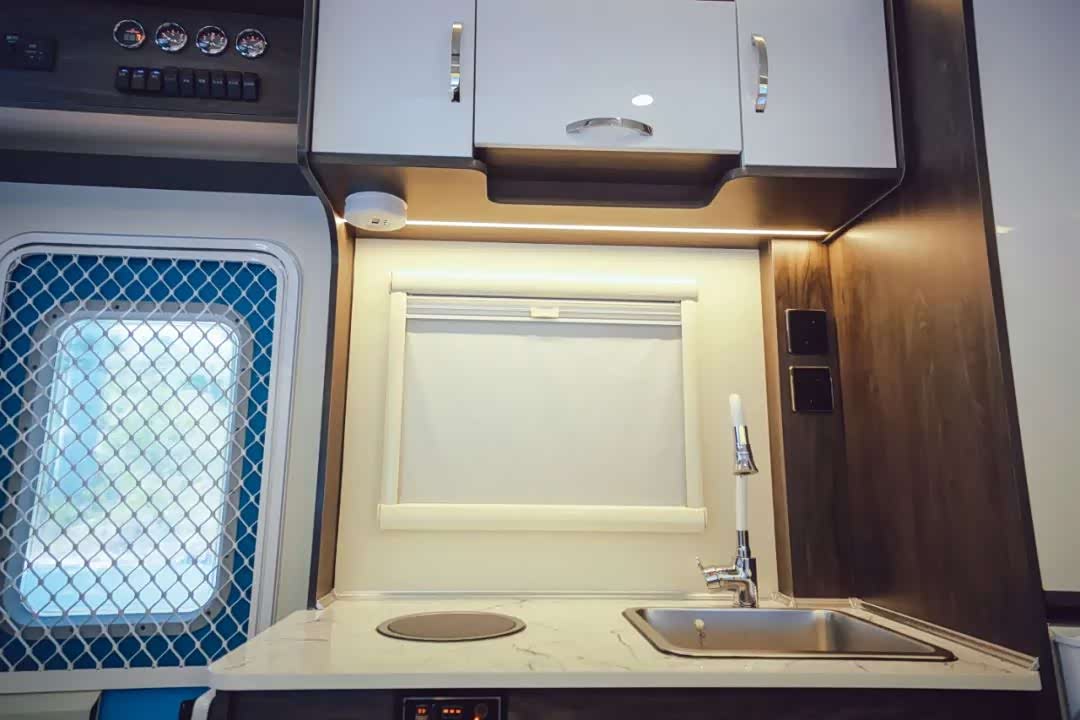 卫浴区采用的干湿一体式设计,内部设备齐全,配有洗手池、独立沐浴花洒、三乔旋转坐便器、通风窗、换气扇、毛巾架、储物格等。 水路方面,大水大电,配有300L冷热双水箱、80L的灰水箱。在水电加大的基础上,凤凰房车C1系列-风尚版设计标准是在户外可以3-4天驻车不动。