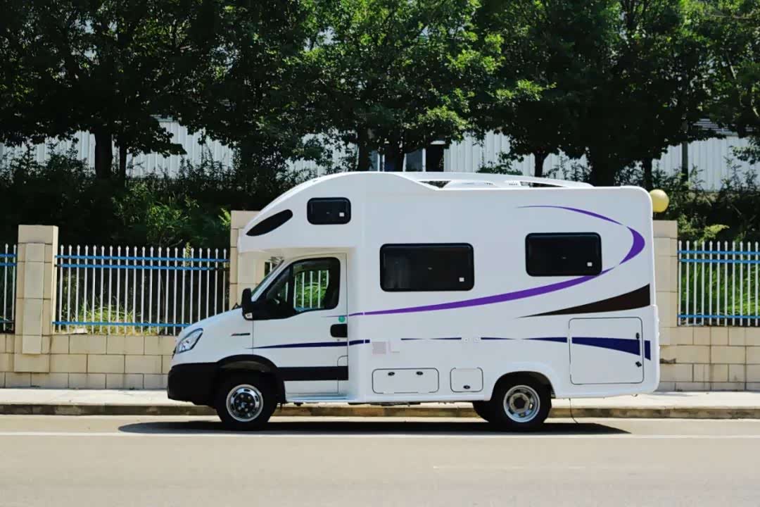 外观方面,以白色涂装为底色,车侧搭配紫、蓝、棕三色拉花,飘逸灵动,简约大气。车身采用三明治复合厢体,外板为FRP材质,打造更轻量化的车身。C型大额头造型为整车增添稳重感。车身尺寸为5995×2410×3200mm,轴距为3300mm,车长不足6m,蓝牌C照即可驾驶。整车可荷载4-6人。