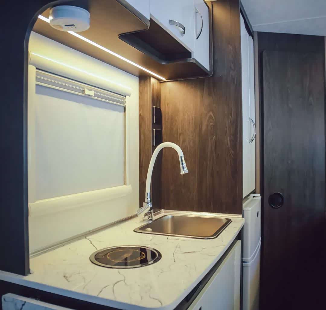来到厨房区域,料理台面配有洗菜盆、大弯水龙头、800W电磁炉,在料理台一侧旁边标配88L冰箱,便于冷藏食物。冰箱上方还贴心地设计了衣柜,便于折叠收纳衣物。说到储物空间,这款车的内部储物空间值得称道,角落里吊柜、抽屉、衣柜、鞋柜等均有配备。