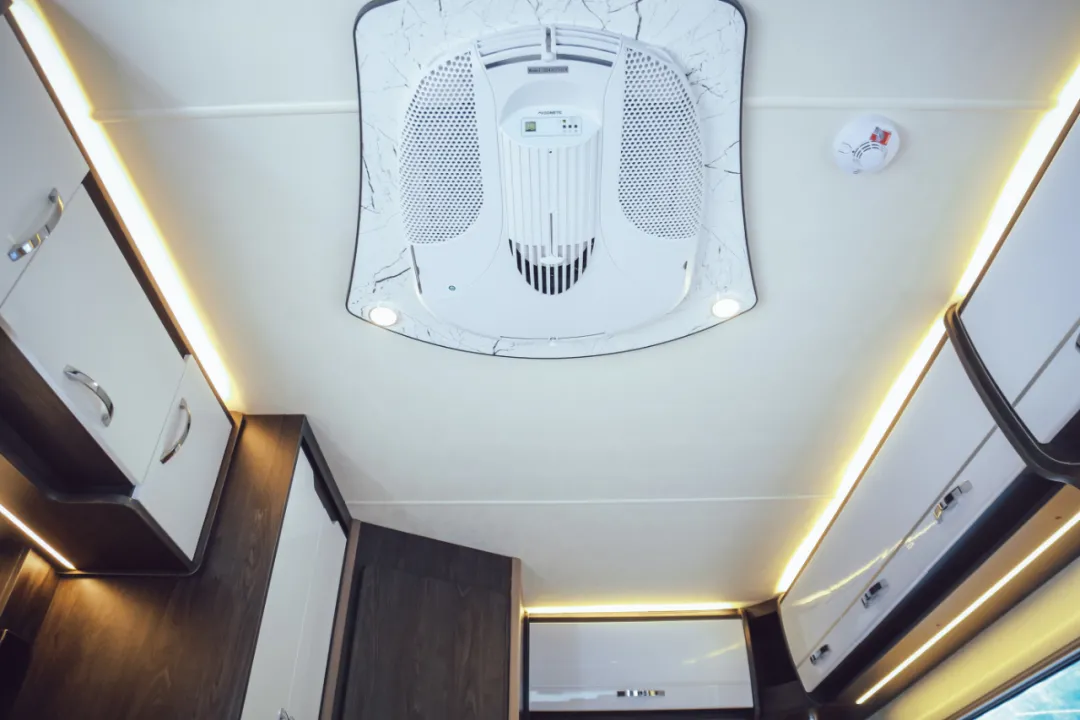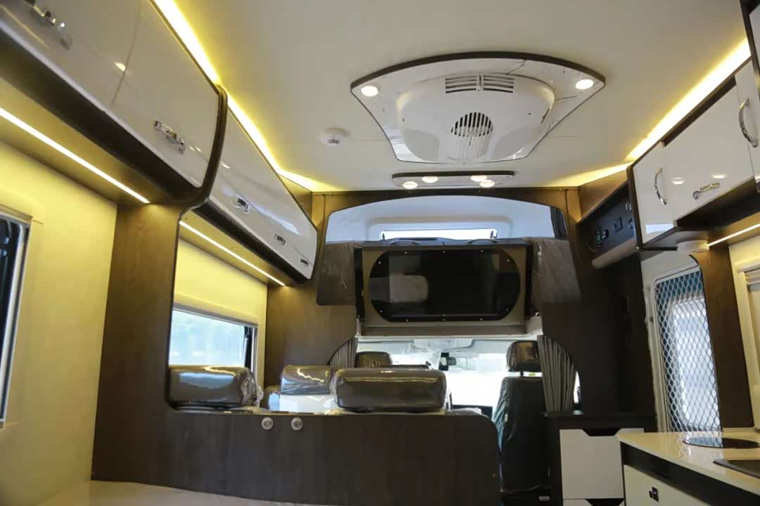 车内顶部配备顶灯与氛围灯,简约不杂乱,暖调灯光增加室内温馨氛围。家具的选材也颇有品质,选用E0级环保家具板,搭配仿实木地板革,增加内饰质感。同时,内壁选用PVC覆膜板,既可以避免刮擦又显档次。