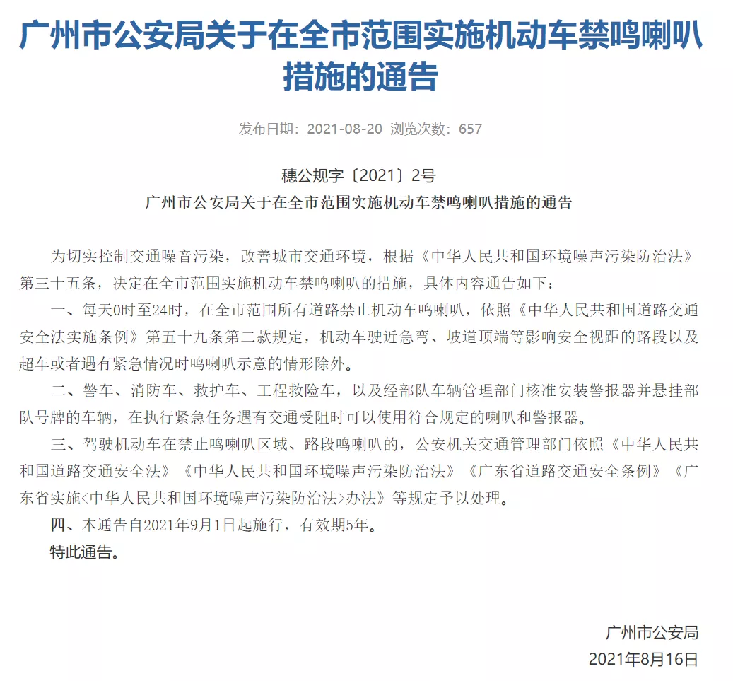 近日,广州市公安局发布了《关于在全市范围实施机动车禁鸣喇叭措施的通告》,明确在全市范围内实施机动车禁鸣喇叭的措施,该措施于2021年9月1日施行,有效期为5年。