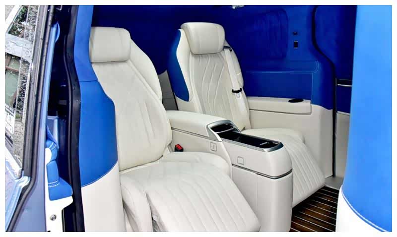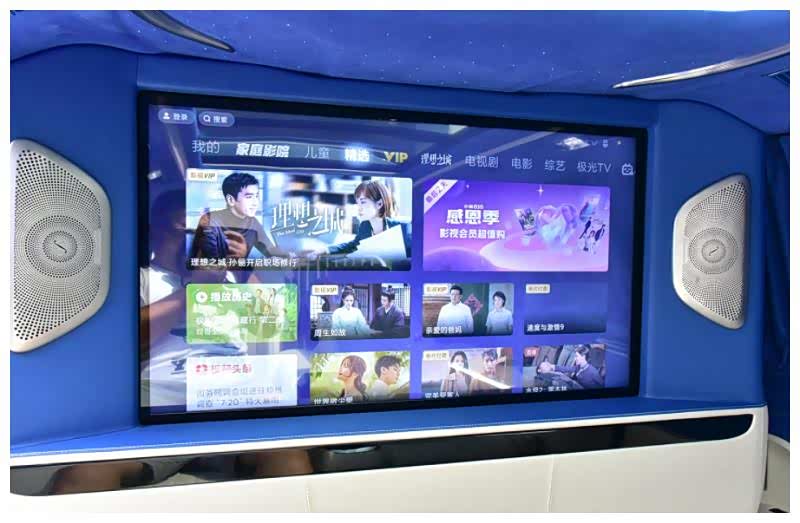 四座版车型内饰以蓝白色调为主,中控台全部采用了蓝色包覆,而座椅色则是白色的。同时采用2+2的座椅布局,在后排配备有超大尺寸可升降电视,电视机的下方配备了专门用来放置游戏机的夹层,真正做到影音娱乐两不误。座舱上方保留天窗,同时前后排均支持开启,天窗周围是一圈氛围灯和星空灯,从而营造出豪华的车内氛围。