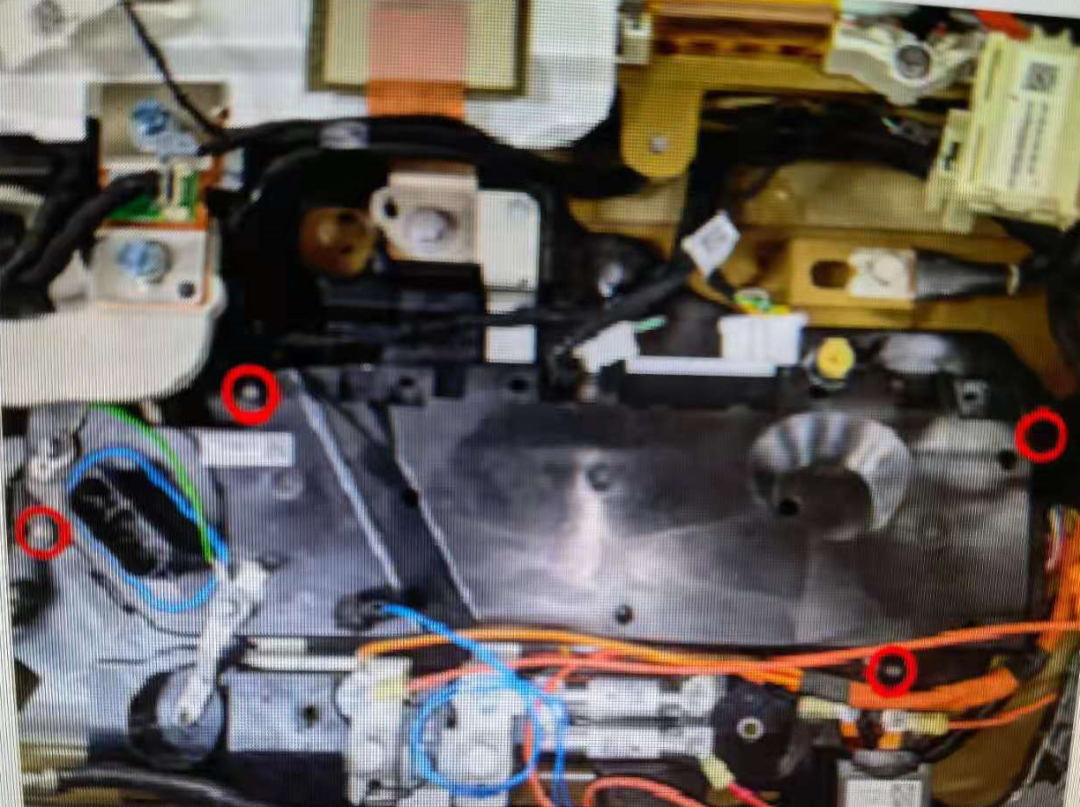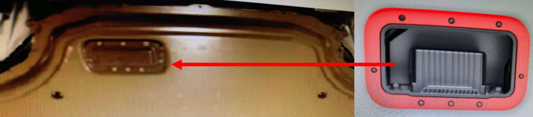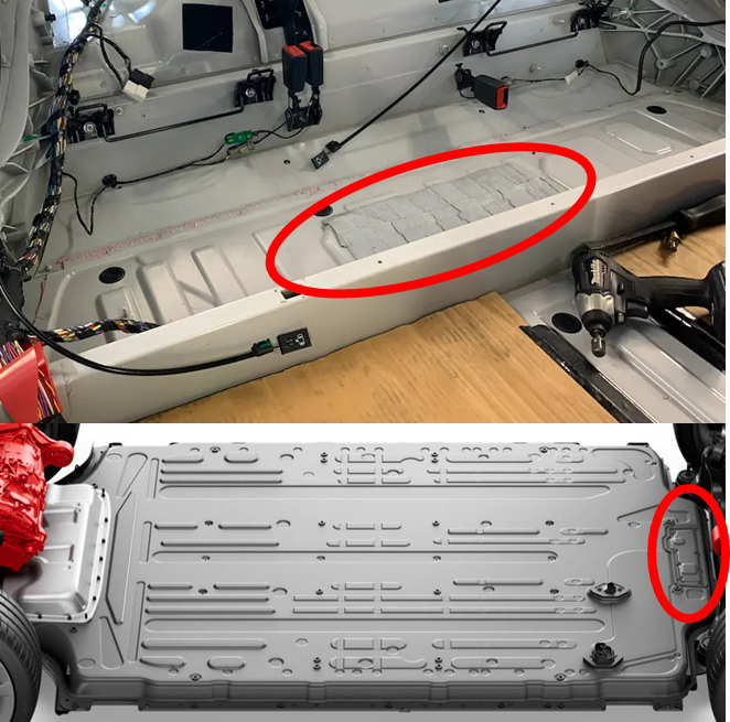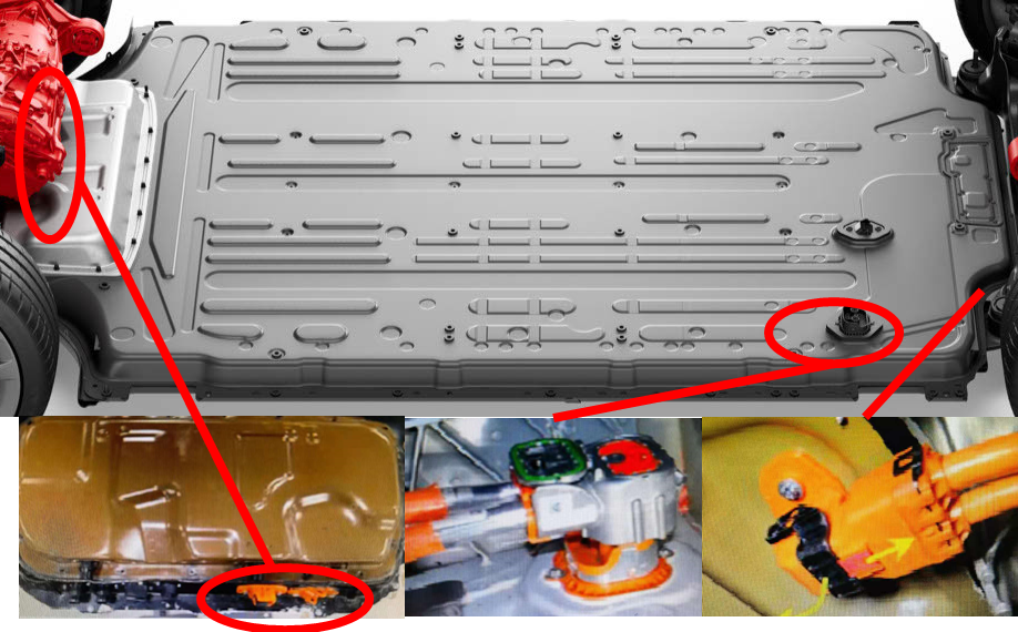2. 后驱驱动逆变器连接器:布置在电池后方的底部,如下图所示;