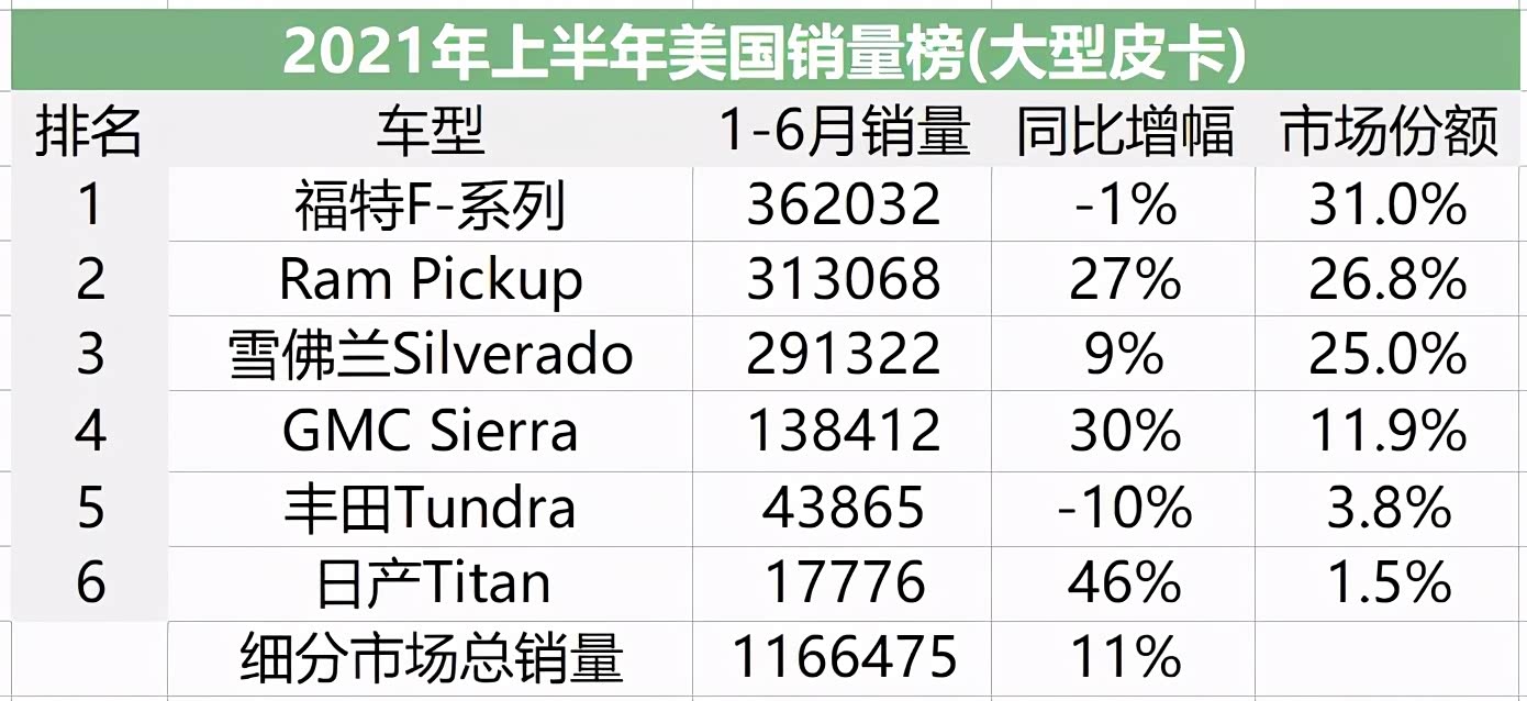 当然,美国皮卡市场的重头戏,还是在大型皮卡级别,上半年销量规模达到116.6万辆,是中型皮卡的三倍以上,而在这个市场中,美系本土品牌的地位,就完全不可撼动了。