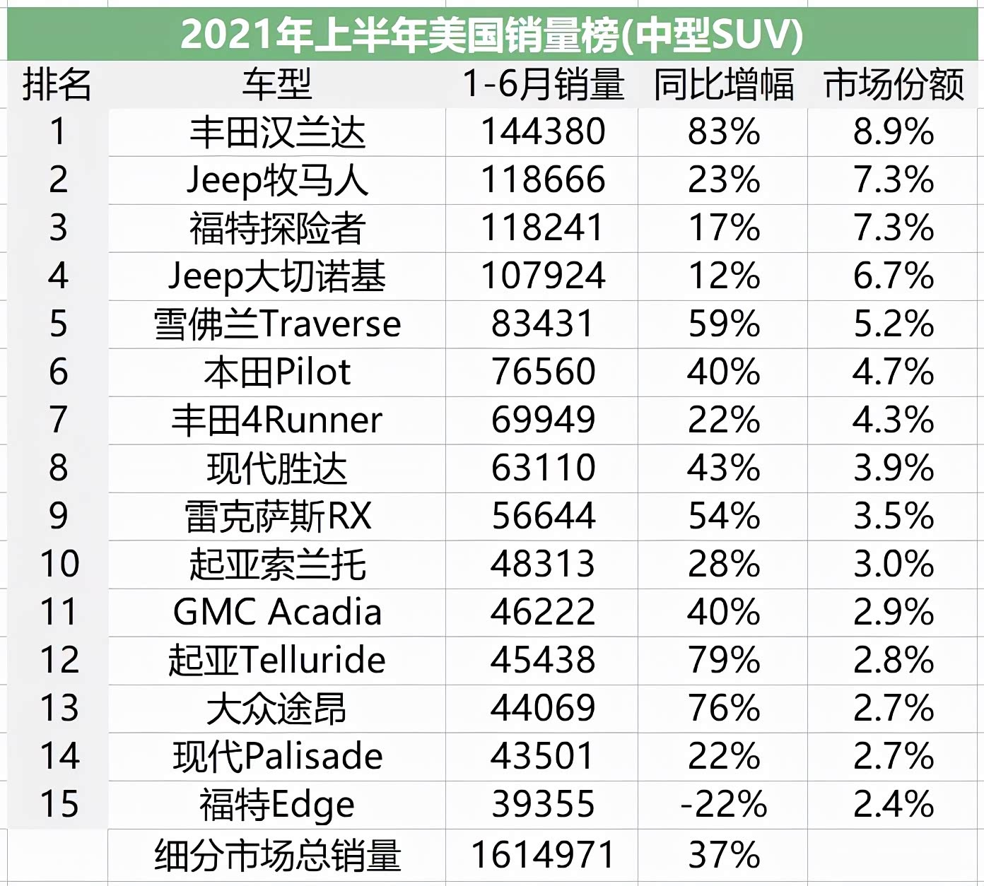 今年上半年,美国的中型SUV市场规模达到了161.5万辆,在美国各类细分市场中仅次于紧凑级SUV。