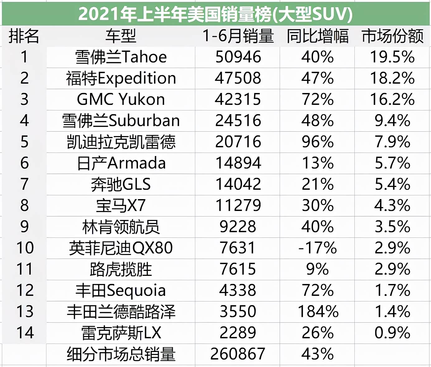 而在中国,类似奔驰GLS、宝马X7、林肯领航员等车型,上半年的进口量都只有数千辆,而美国大型SUV市场销量最高的车型,上半年的销量已经突破5万辆: