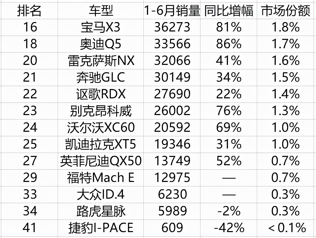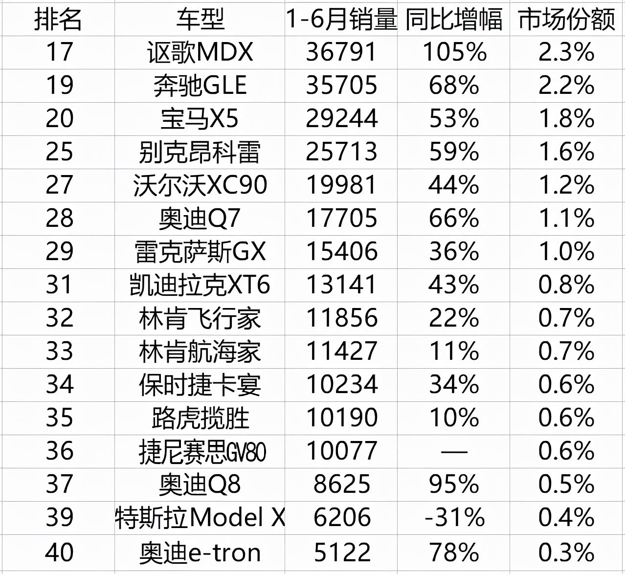 宝马X3、奥迪Q5、雷克萨斯NX和奔驰GLC的销量都比较接近,上半年累计销量超过3万辆,此外讴歌RDX、沃尔沃XC60、凯迪拉克XT5等车型的差距也都不算大。但是和Model Y相比的话,传统豪华品牌在这个细分市场的销量规模,都被远远拉开了。