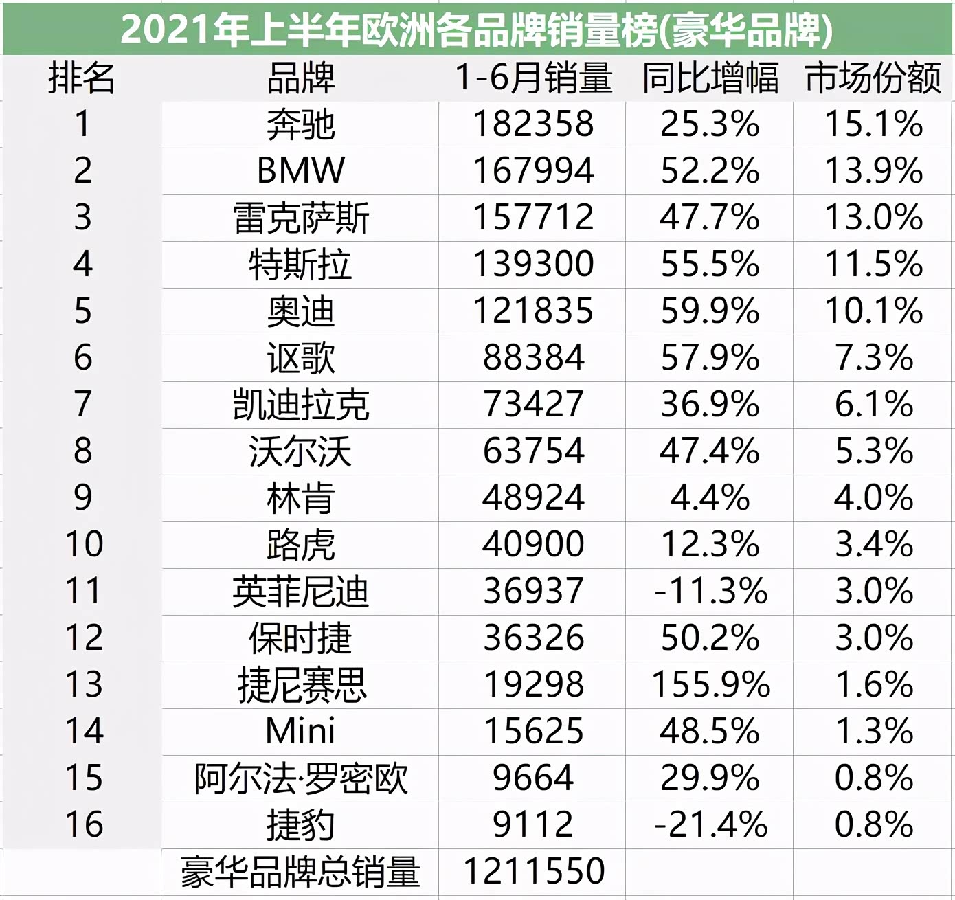 销量最高的奔驰,上半年累计销量18.2万辆,品牌月均销量超过了3万辆,在豪华品牌的市场份额达到15.1%。第二、三名的宝马和雷克萨斯,同奔驰的差距也不大,市场份额均达到13%以上,而且销量同比增幅都达到了50%左右。