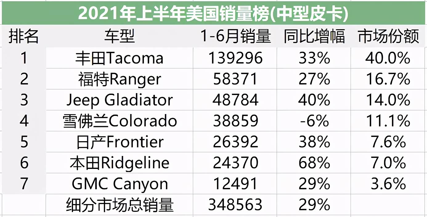 Tacoma之后,福特Ranger、Jeep Gladiator和雪佛兰Colorado这三款美系车型占据2-4名,三款车型的总销量,才勉强超过了排名第一的Tacoma。