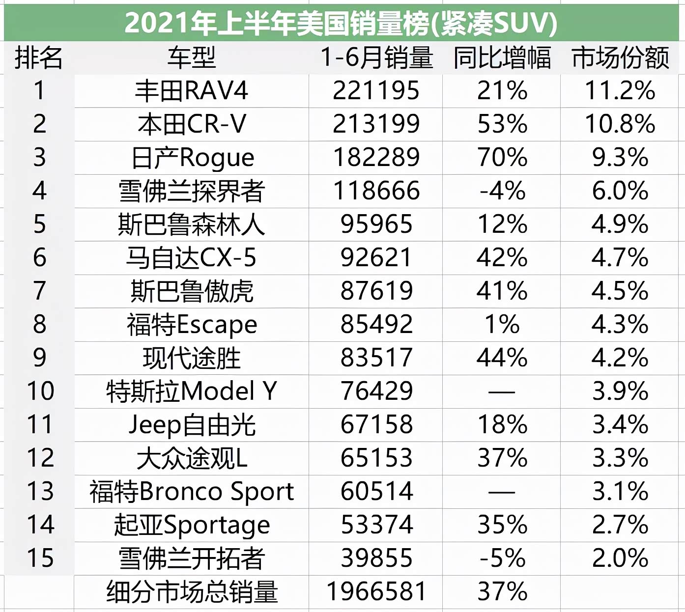 紧凑级SUV不但是美国SUV类别中最大的细分市场,也是美国所有类别中最大的,上半年销量规模达到196.7万辆,是小型SUV市场的三倍,在美国整体市场中的份额达到了24%,相当于整个轿车市场的规模。