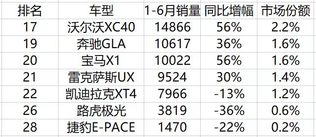 而类似奥迪Q3、宝马X1这类豪华入门级SUV,在美国被划到了小型SUV的类别,其中销量最高的奥迪Q3上半年也仅仅售出18445辆,沃尔沃XC40超越了奔驰GLA和宝马X1,而雷克萨斯UX、凯迪拉克XT4等车型,也都排在更靠后的位置。