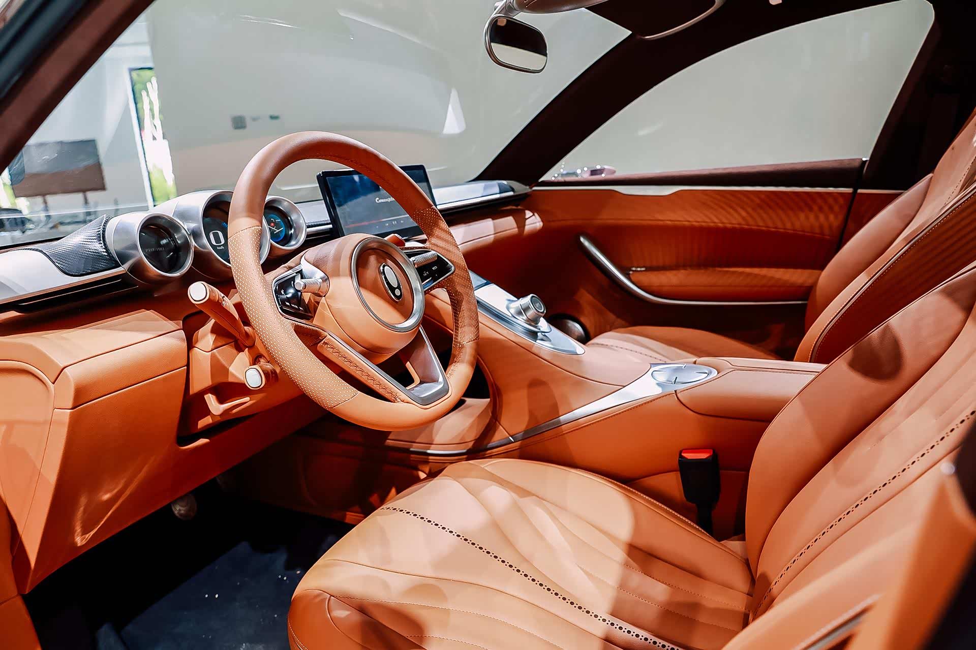 据了解,未来闪电猫将会推出高性能版车型,所以在座椅配置上绝对不能含糊。一体式运动座椅造型宽大,带有多项电动调节功能,头枕和椅背之间有金属镂空装饰,座椅边缘使用白色缝线点缀,视觉效果十分不错。由于不是量产车型,我们无法实际乘坐体验。