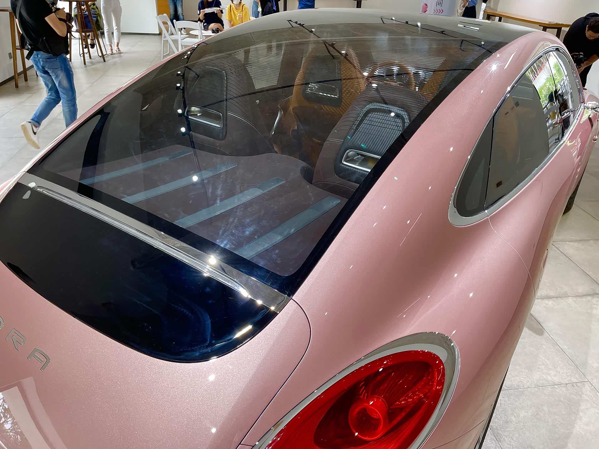从尾部高处俯瞰,闪电猫的车尾设计形似飞行器,大面积的玻璃、通透的内饰,看起来很有未来感。根据官方的介绍,未来量产版车型上后尾门会增加尾翼的装置。