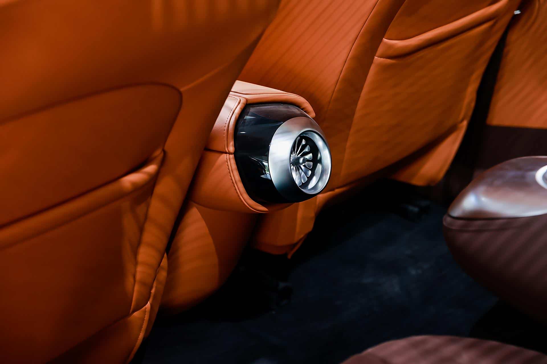 2800mm的轴距带来了相当不错的第二排乘坐空间,整车为四座设计,第二排同样为一体式独立座椅,巨大的单孔圆形空调出风口造型还是很惹眼的。