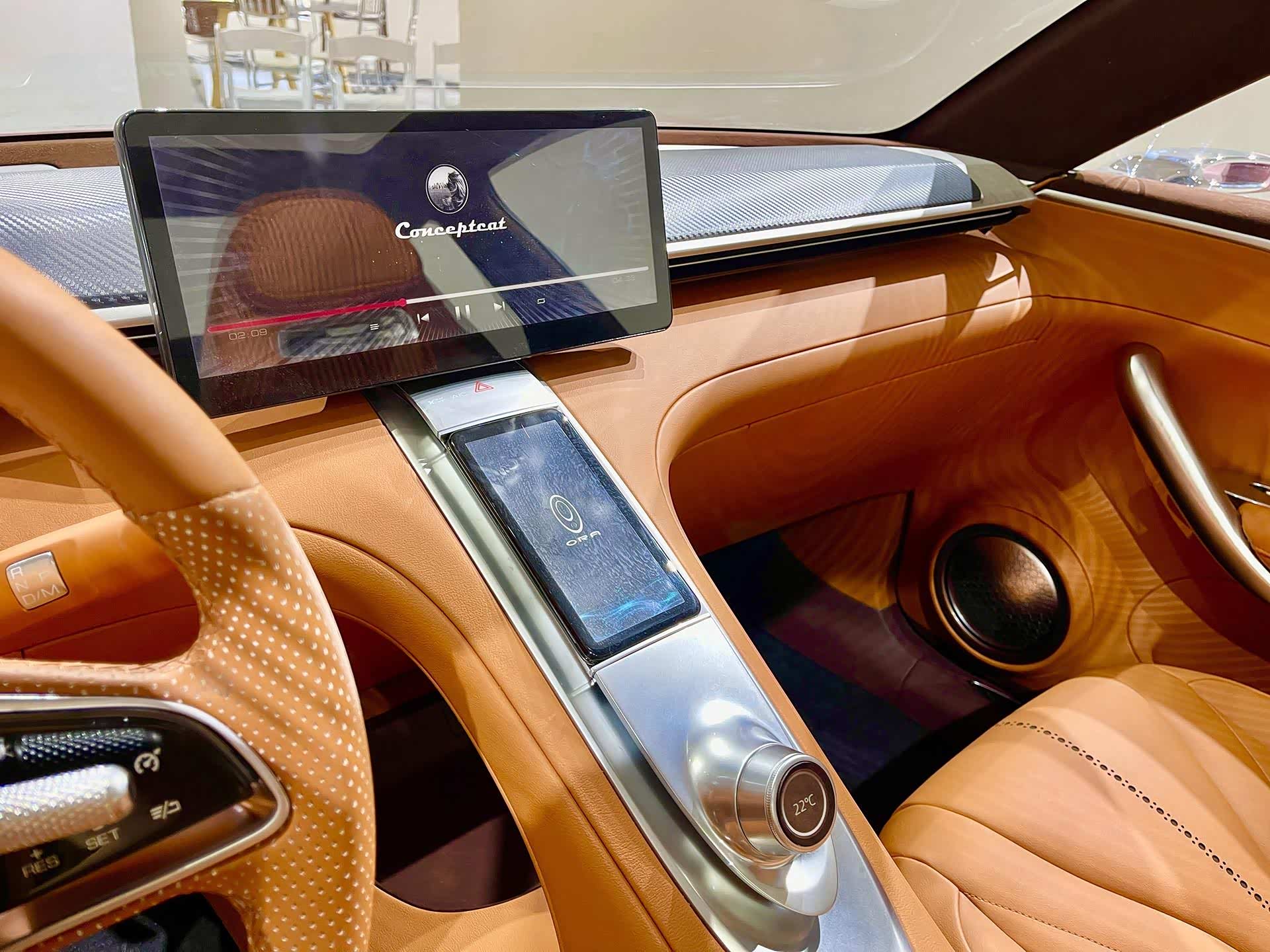 悬浮式的中控屏尺寸不小,中控屏下方是一块空调控制屏幕,并且只有一个空调旋钮,没有其他多余的物理按键。
