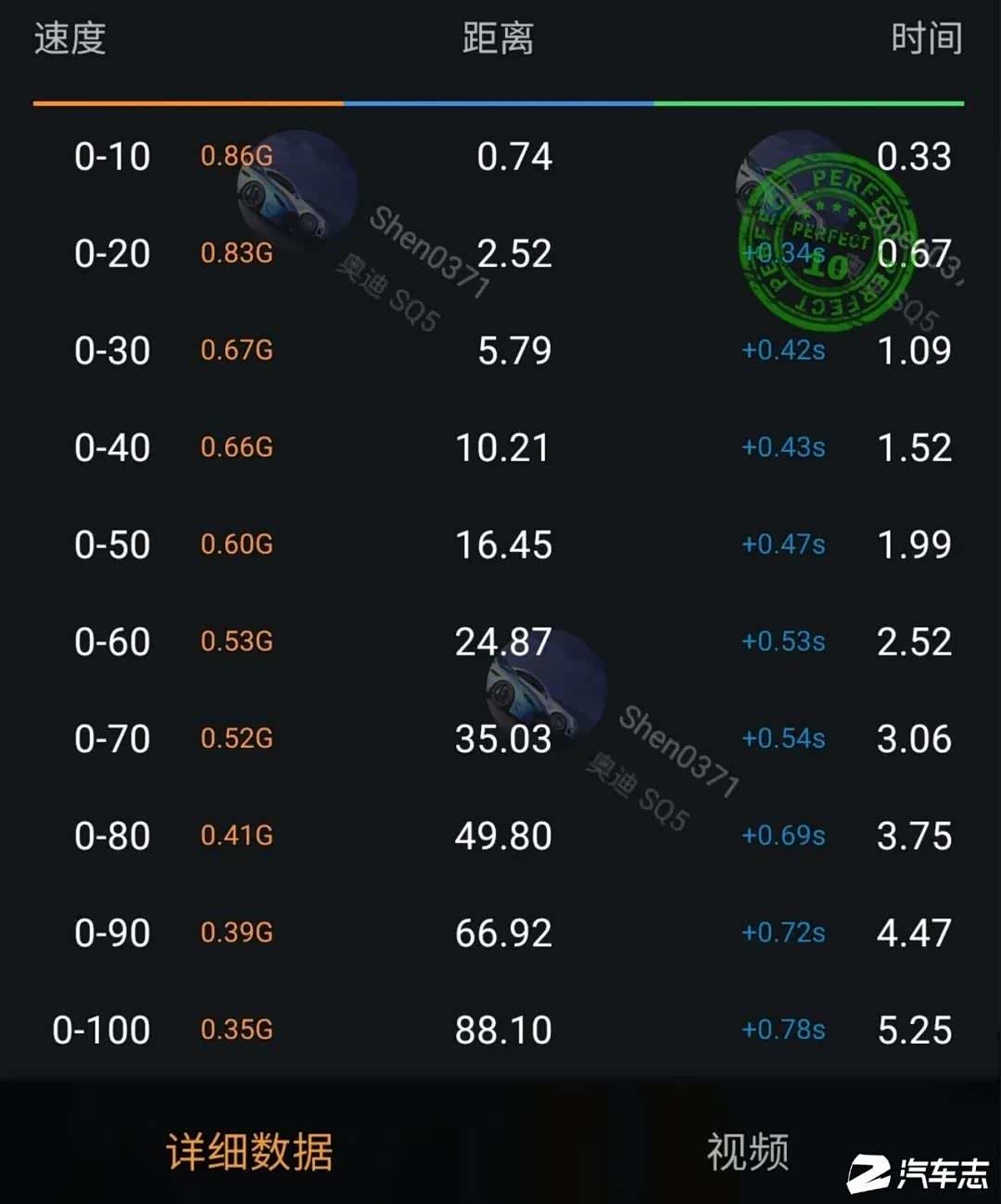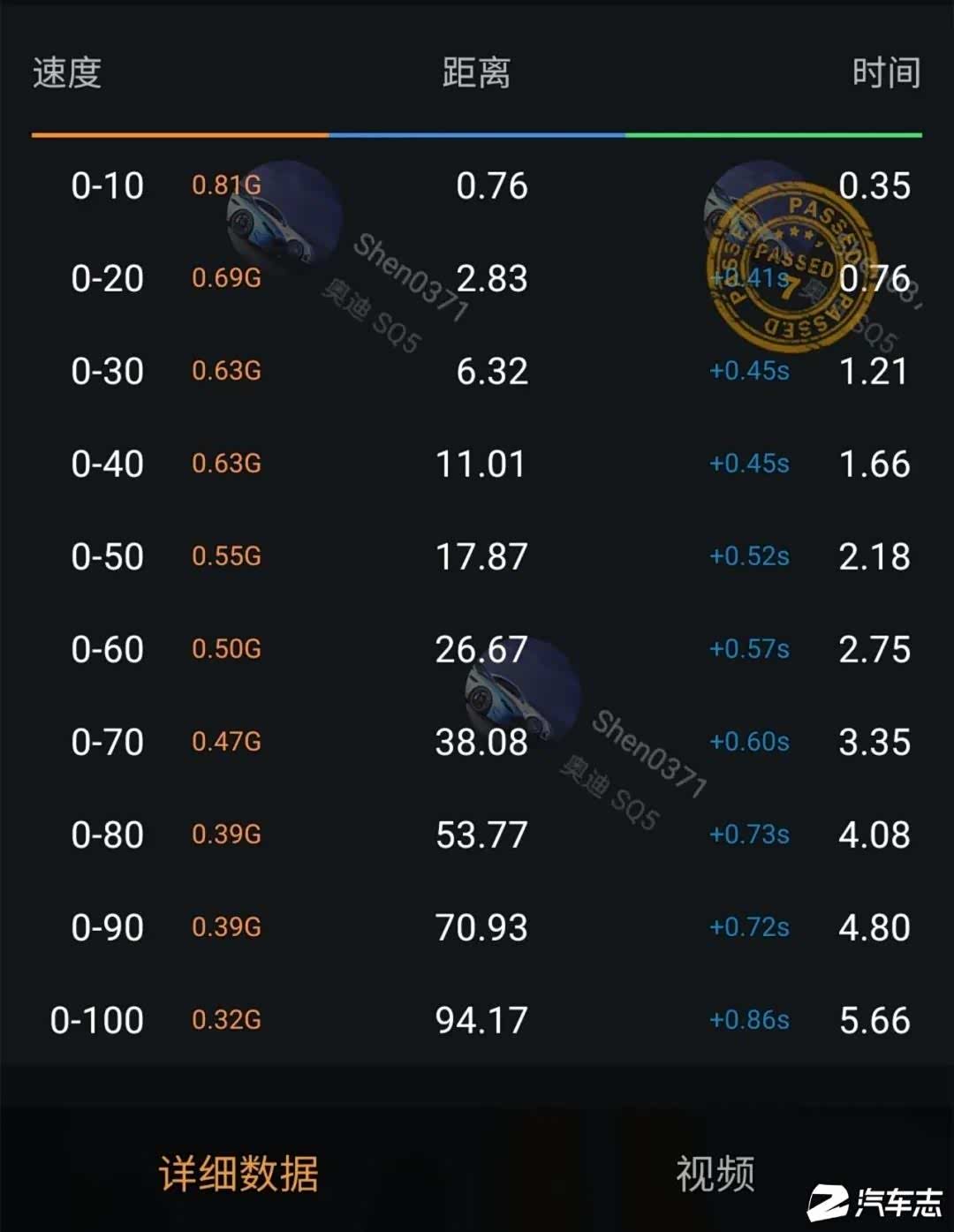 我们拿到奥迪SQ5的当天就去实测了0-100km/加速,测试时的气温在34度,纯原厂状态下测得了5.66秒,而官方标称5.3秒。对于一辆涡轮车来说,在这样的高温天气下测得这样一个成绩也算是合理。