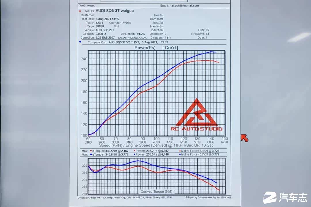 当天气温超过34°C,仪表显示的周围环境温度更是高达40°C,SQ5原厂拉出的轮上马力为253.5,扭矩为343.8牛·米。官方标称的发动机曲轴端马力为354,毕竟SQ5是一辆四驱车,在经过变速箱、传动轴、中央差速器、前后轴差速器、半轴、轮胎等部件损耗之后,得出的这个轮上数据属于正常值的范围之内。另外当天气温较高,高温空气含氧量较低,也一定程度上影响了发动机的输出。