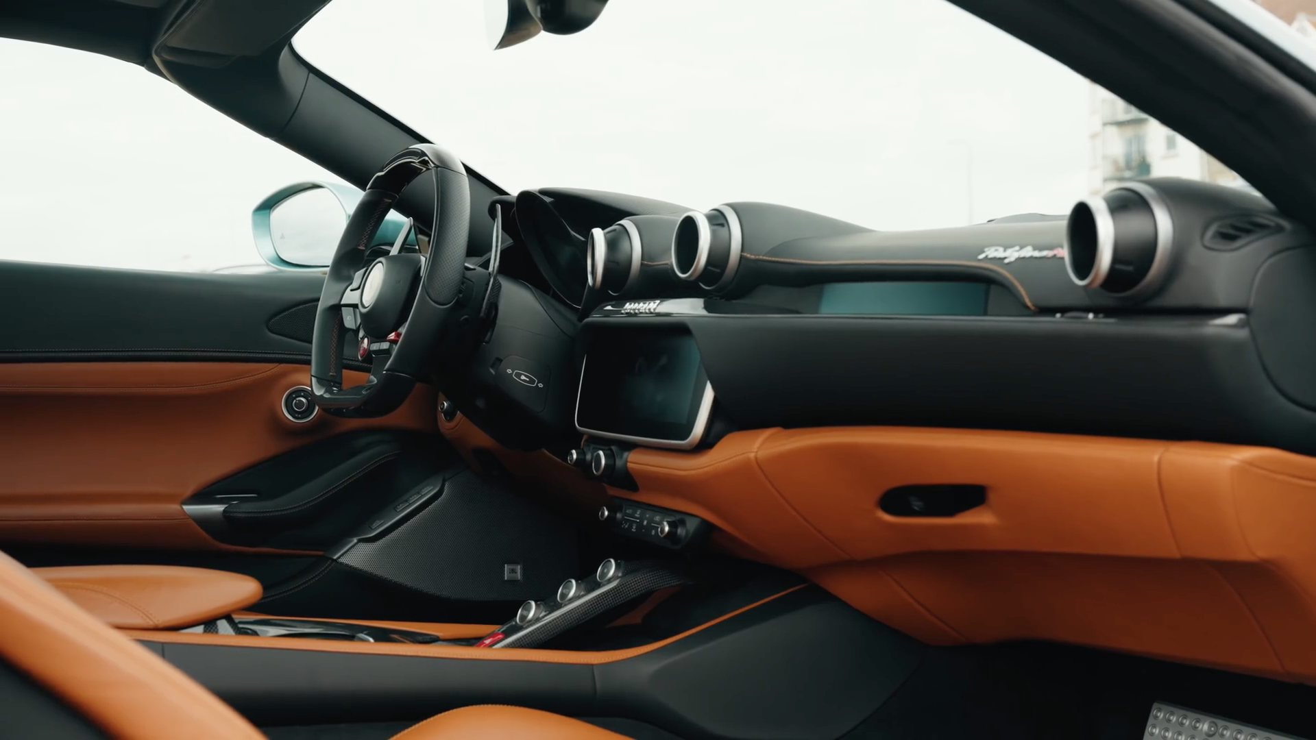 Portofino M内饰采用经典颜色搭配,大面积真皮包覆,做工精致,营造出的战斗氛围浓厚,经典的“万转”表底机械转速表搭配两侧液晶屏幕,构成显示信息丰富的仪表盘,