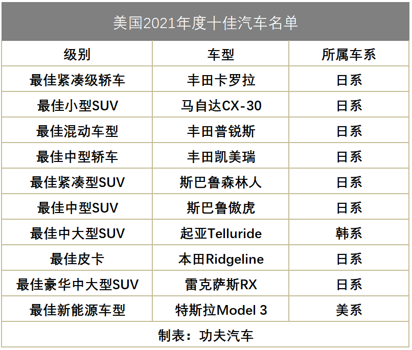 前几日,美国最权威的《消费者报告》公布了2021年度的十佳汽车名单,也是通过车主调查得出的各级别最值得推荐车型的名单。美国一向是日系车的大本营,本次榜单有8款日系车上榜,甚至连最佳皮卡的名额,也被本田Ridgeline夺得,剩下两款分别是特斯拉Model 3和起亚Telluride。