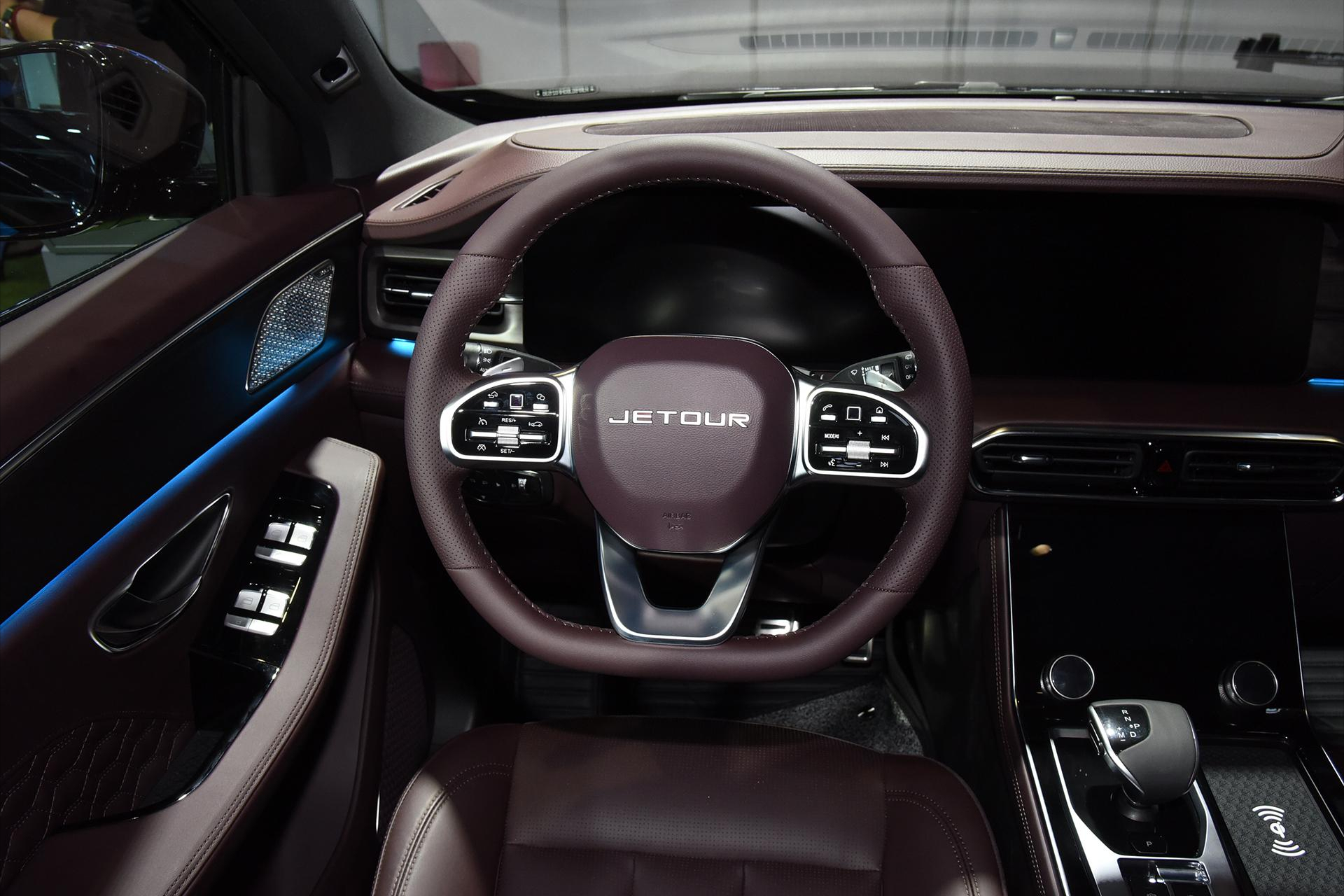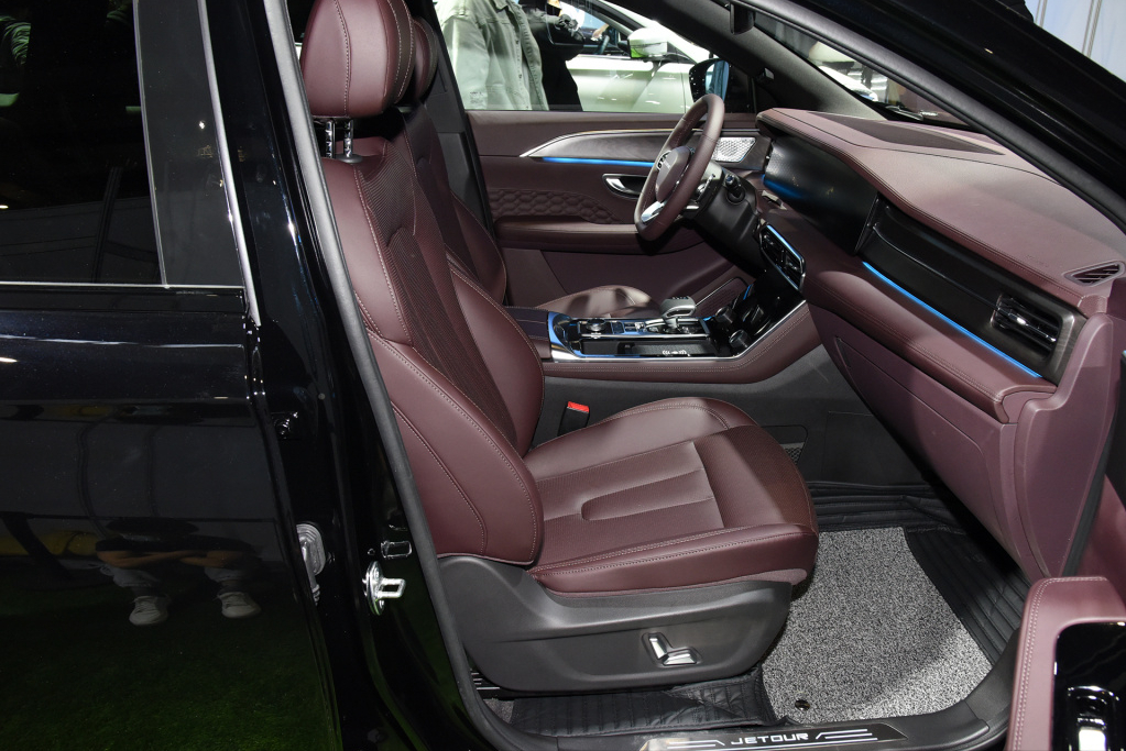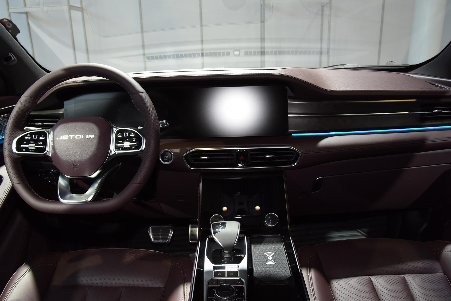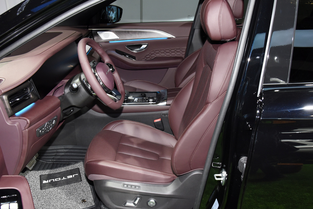 先从外观说起,新款车型在整体保持捷途X90的基础上,进行了一些调整,前格栅维持现状,依旧是“徽城翘楚”式设计,主打东方美学的大气之美,大量镀铬装饰堆砌,大大提高了前脸的冲击效果。大灯在形状上有所调整,下沿式设计与下方灯源呼应。从整个前脸来看,新车的力量感提升尤为明显。