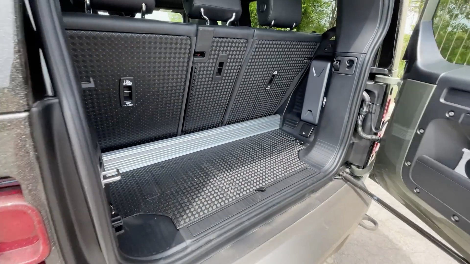 卫士90上还有两个非常值得称道的设计,一个是地板和后备箱均采用了橡胶材质铺设,防水防滑、耐磨度和易打理方面都有不错表现,普通越野车里最让车主头疼的泥土问题,路虎卫士上直接用水清洗即可,而且平直的座舱地板完全不用考虑会积水的问题。第二个是后排被称为“阿尔卑斯之光”的侧顶窗设计,虽然尺寸不大,但是足够让你在行驶的车内,就可领略雪山之巅的美丽。
