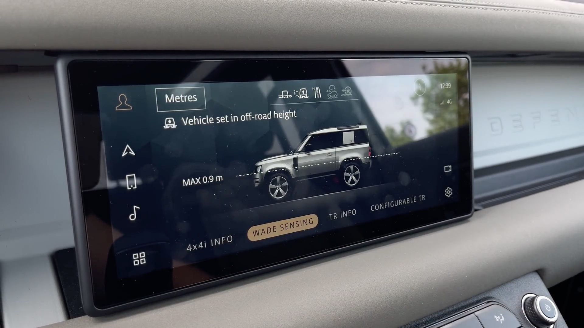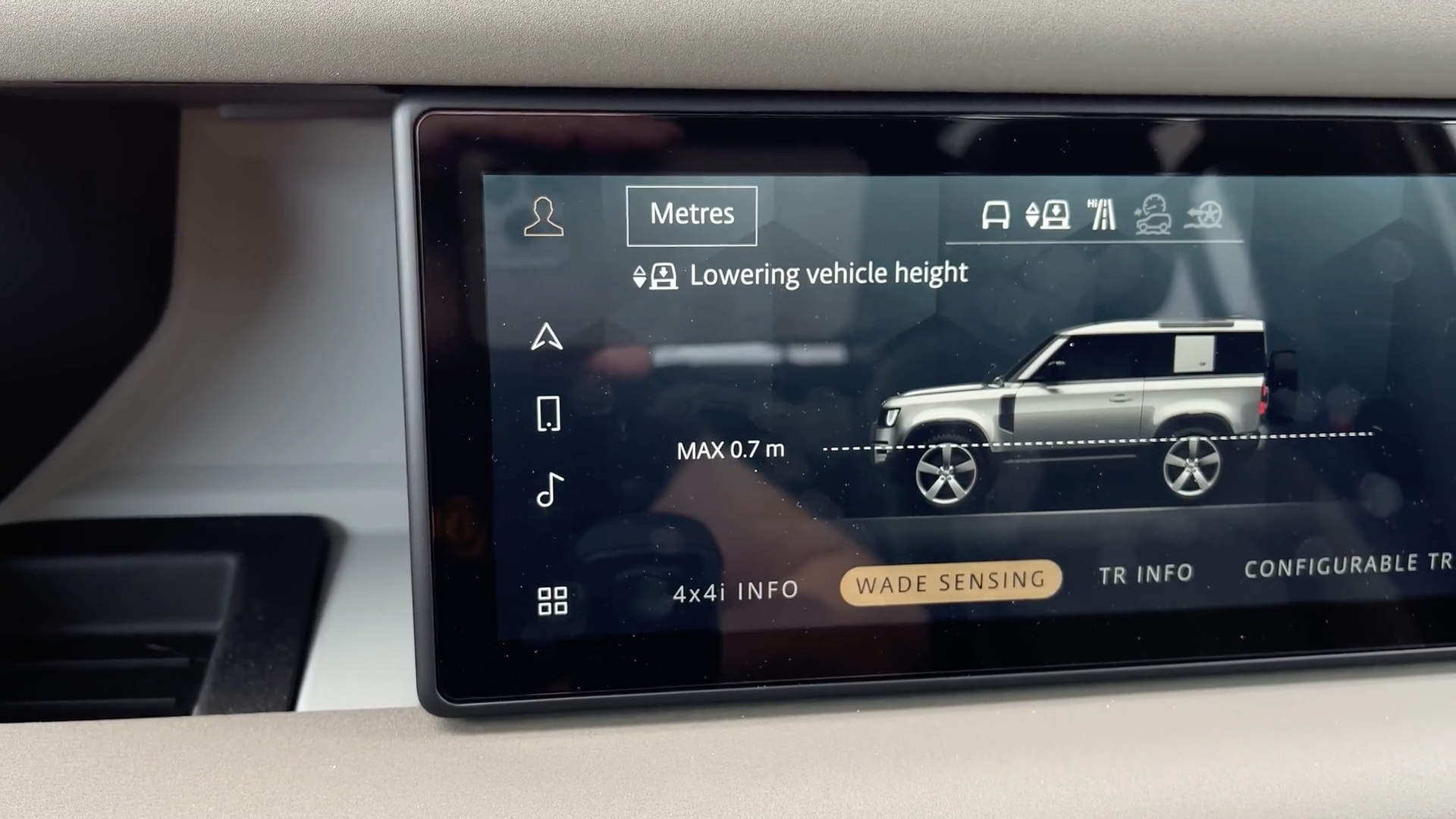 为了提升涉水深度,卫士90等发动机进气口设置在了左侧翼子板,涉水深度接近900毫米。路虎还为卫士装备了涉水模式,开启这个模式,系统将自动通过声纳测量反光镜下沿与水面距离,以判断涉水深度,动态调节车辆各部件度运行模式,帮助驾驶者可轻松通过涉水路况。