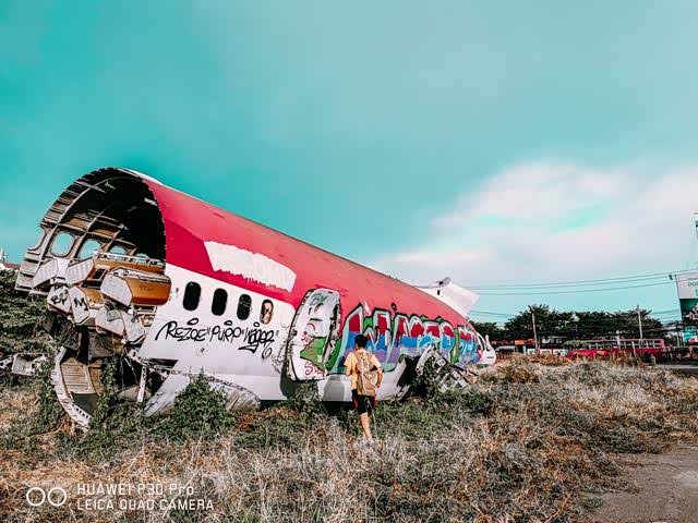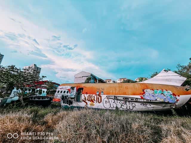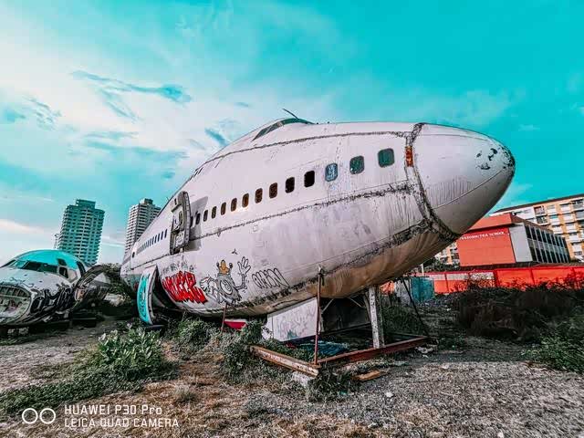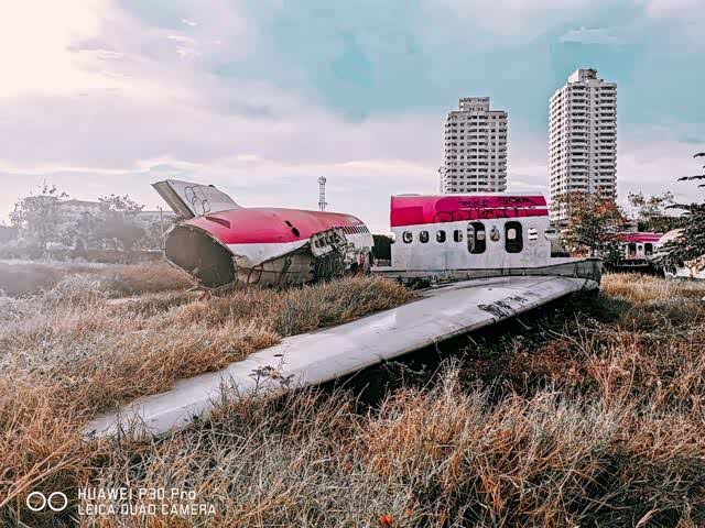 它就在在曼谷蓝甘杏往minburi方向路边一处开阔又荒凉的开阔空置地块上,里面存放着六架大型飞机残骸,被人称为“飞机墓地”。在里面你可以看到废弃的麦道MD-82、波音747等民航客机的机翼、机身残骸。