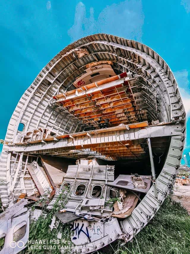 再往里走就是飞机残骸了,有两架可以攀爬,但是小心哦,因为飞机外壳上到处都是锋利的铝皮豁口,机舱地板上散落着许多损坏的飞机部件。我们在机舱里面走动的时候,需要时刻注意脚下、头上,以免划伤、扎伤。