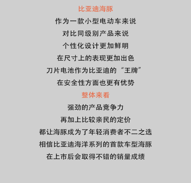 比亚迪海豚作为一款小型电动车来说,对比同级别产品来说,个性化设计更加鲜明,在尺寸上的表现更加出色,刀片电池作为比亚迪的“王牌”,在安全性方面也更有优势。整体来看,强劲的产品竞争力,再加上比较亲民的定价,都让海豚成为了年轻消费者不二之选,相信比亚迪海洋系列的首款车型海豚,在上市后会取得不错的销量成绩。