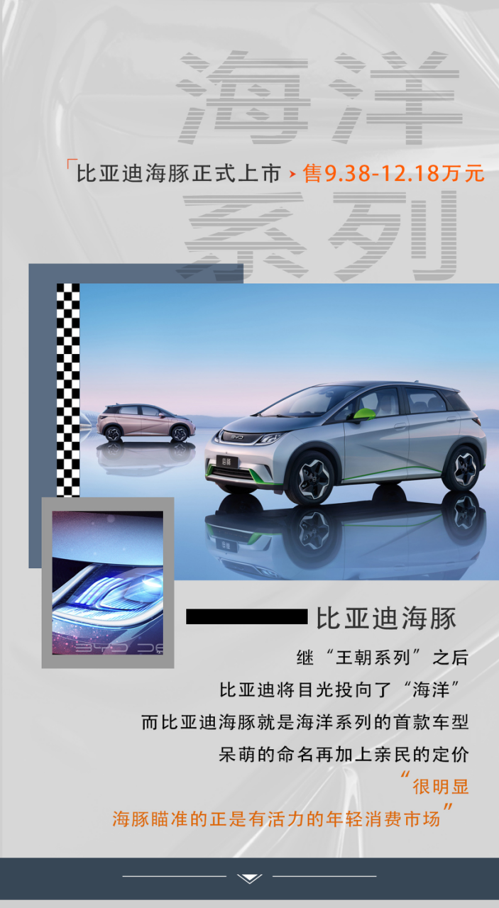继“王朝系列”之后,比亚迪将目光投向了“海洋”,而比亚迪海豚就是海洋系列的首款车型。呆萌的命名再加上亲民的定价,很明显海豚瞄准的正是有活力的年轻消费市场。