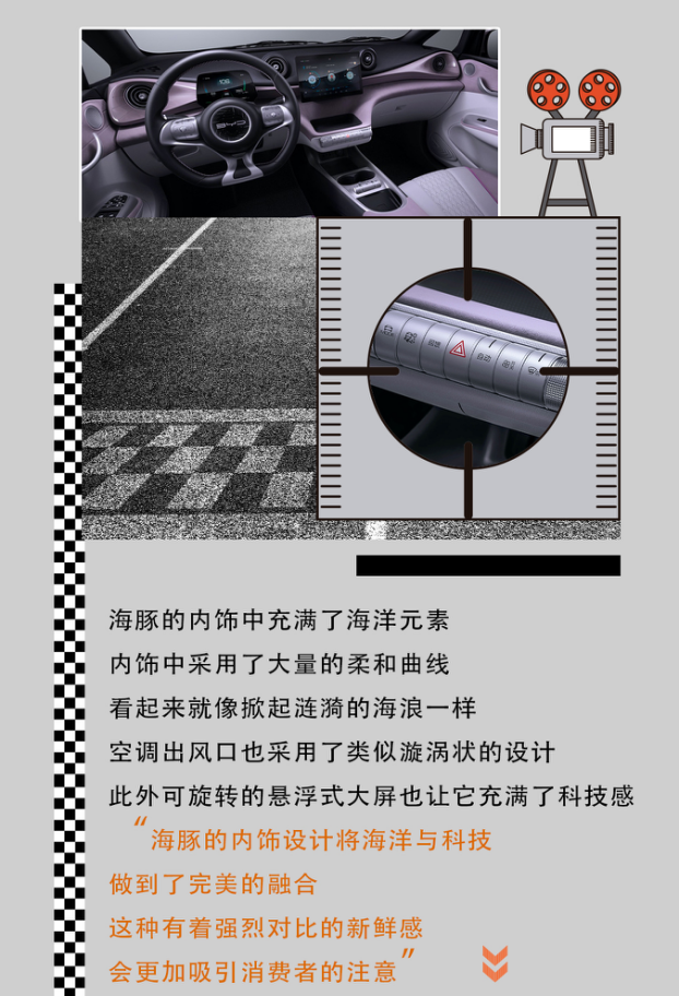 海豚的内饰中充满了海洋元素,内饰中采用了大量的柔和曲线,看起来就像掀起涟漪的海浪一样,空调出风口也采用了类似漩涡状的设计,此外可旋转的悬浮式大屏也让它充满了科技感。海豚的内饰设计将海洋与科技,做到了完美的融合,这种有着强烈对比的新鲜感,会更加吸引消费者的注意。
