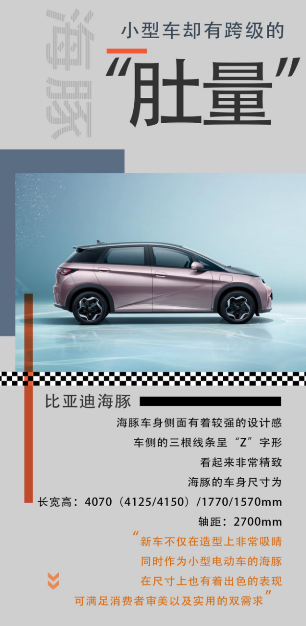 海豚车身侧面有着较强的设计感,车侧的三根线条呈“Z”字形,看起来非常精致。海豚的车身尺寸为4070(4125/4150)/1770/1570mm,轴距:2700mm。新车不仅在造型上非常吸睛,同时作为小型电动车的海豚,在尺寸上也有着出色的表现,可满足消费者审美以及实用的双需求。