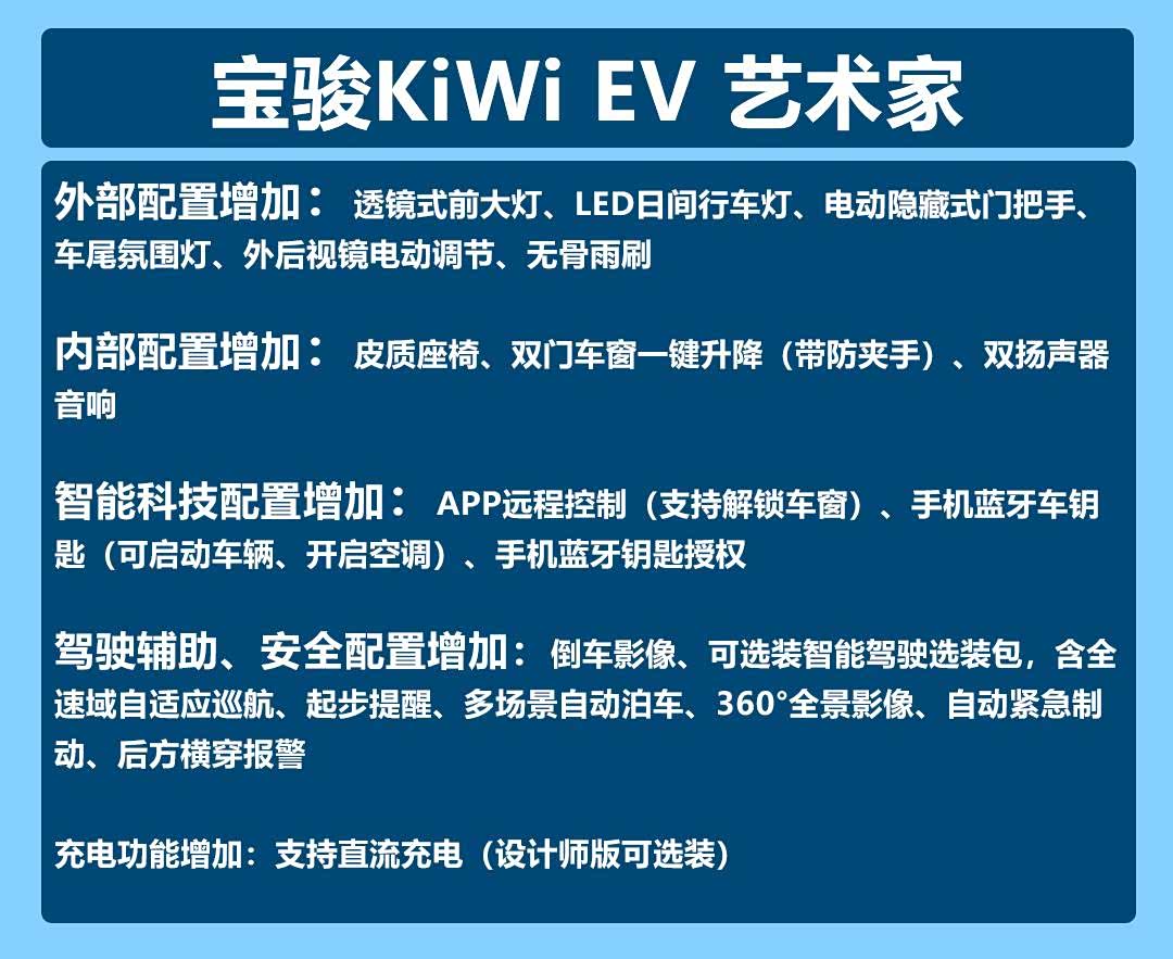 从配置上看,我们不难发现,在售价涨幅并不大的前提下,高配的艺术家版本配置厚度更高,而且增加了诸多便于日常使用的功能,如手机蓝牙车钥匙授权启动车辆、倒车影像、皮质座椅等,也与宝骏KiWi EV主打的高端定位更为匹配。另外,艺术家版车型还支持直流快充(设计师版可选装),综合多方面考虑,我们可以选择艺术家版本。