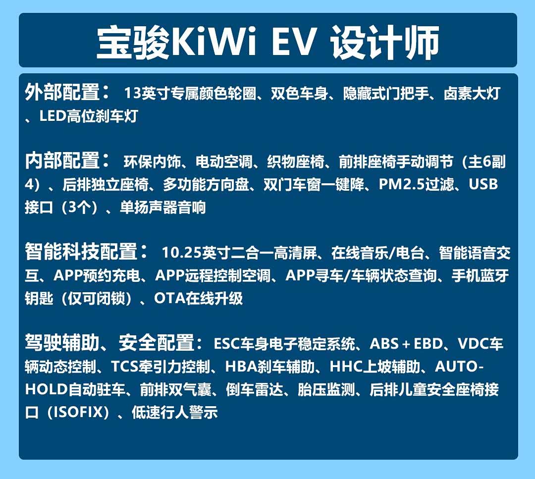 2021年8月31日,上汽通用五菱 宝骏KiWi EV正式上市。新车推出两款车型,售价区间为6.98-7.88万元。新车和此前五菱推出的宏光MINIEV形成上汽通用五菱GSEV产品矩阵。从定位上看,KiWi EV的定位相对更高,定位于精英人群。新车推出设计师和艺术家两个版本,我们怎么选呢?