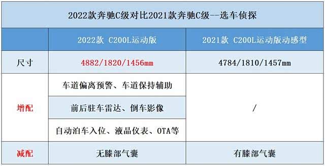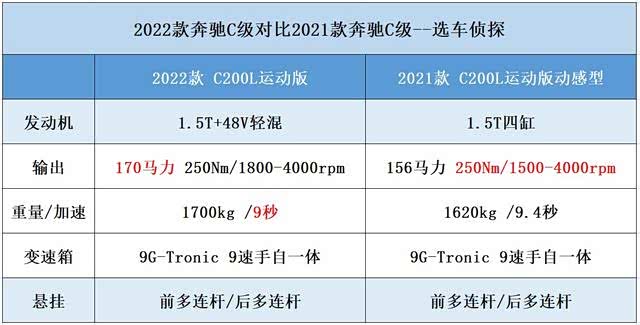 我们选择入门的C200L运动版进行对比,2022款车型更换了全新1.5T发动机,同时加入了48V轻混系统,可以在发动机低转速时辅助车辆起步,提升加速性能。尺寸方面也有所增加,车身加长了98mm,带来了更宽阔的第二排空间,轴距加长34mm。