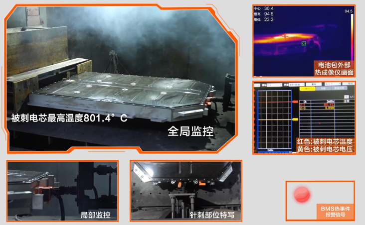这个NTP的验证,是采用了目前大家都会用的针刺试验,用钢针刺入单个电芯触发单个电芯热失控后,然后上面的电池包BMS及时触发热事件报警信号。这里通过红外扫描的情况看,当时电芯最高温度达到801.4℃,并且电池系统排出大量烟雾。这里展示的是,随着电池系统放一段时间以后,单体电压降至0V,温度变为正常,热疏隔阻排设计、整包结构完好,无明显变形,电池外壳不带电,电池包内部固定结构和高压连接完好,无热蔓延。