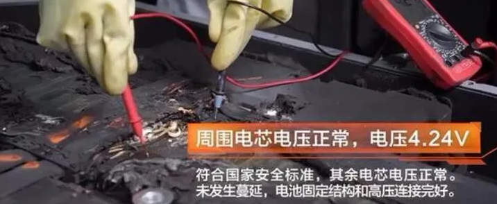 把电池盖拆开以后,我们能看到整个模组的情况,基本是烧黑了。