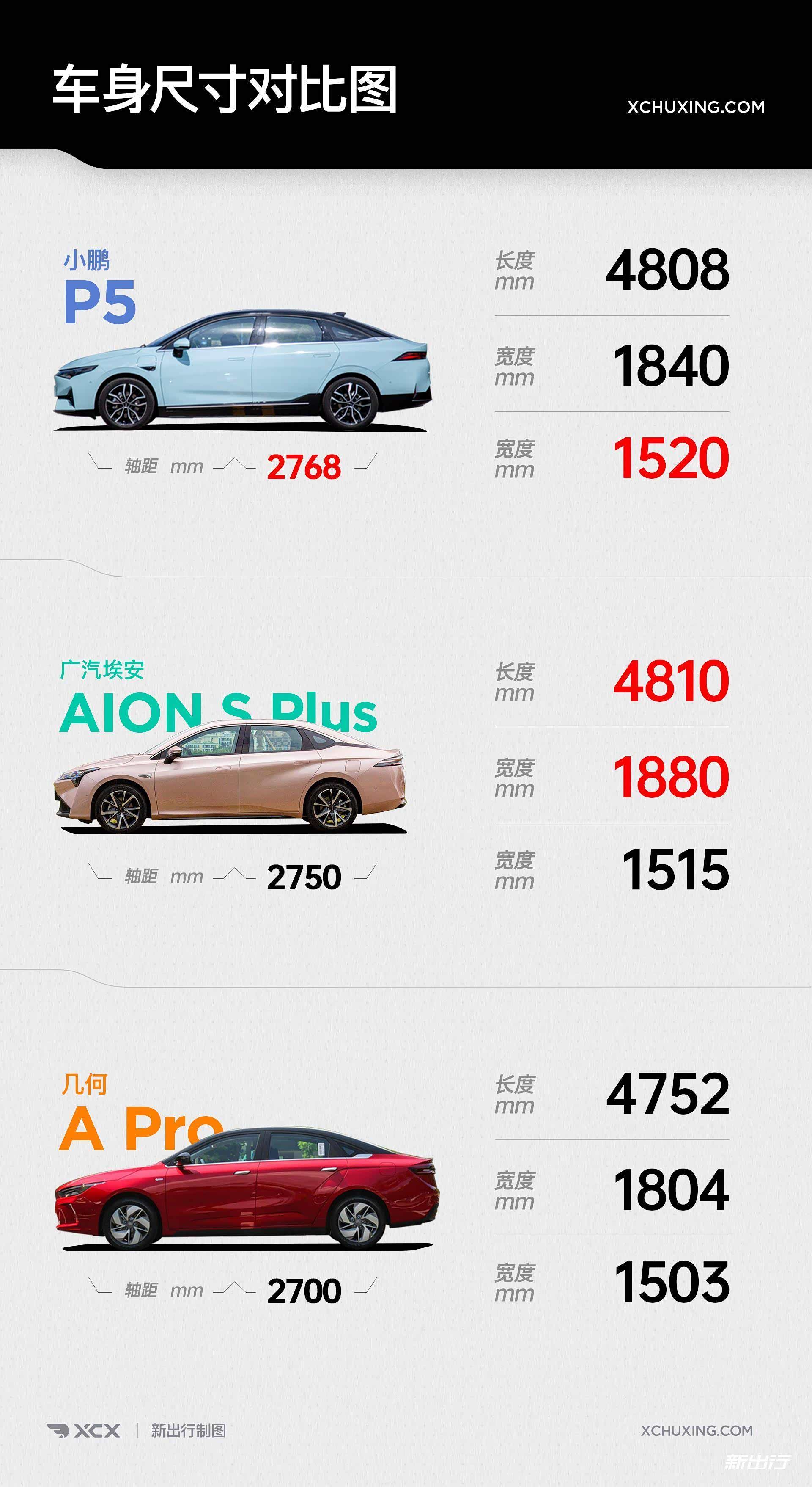 与同级别的车身尺寸对比表,P5 的轴距脱颖而出。